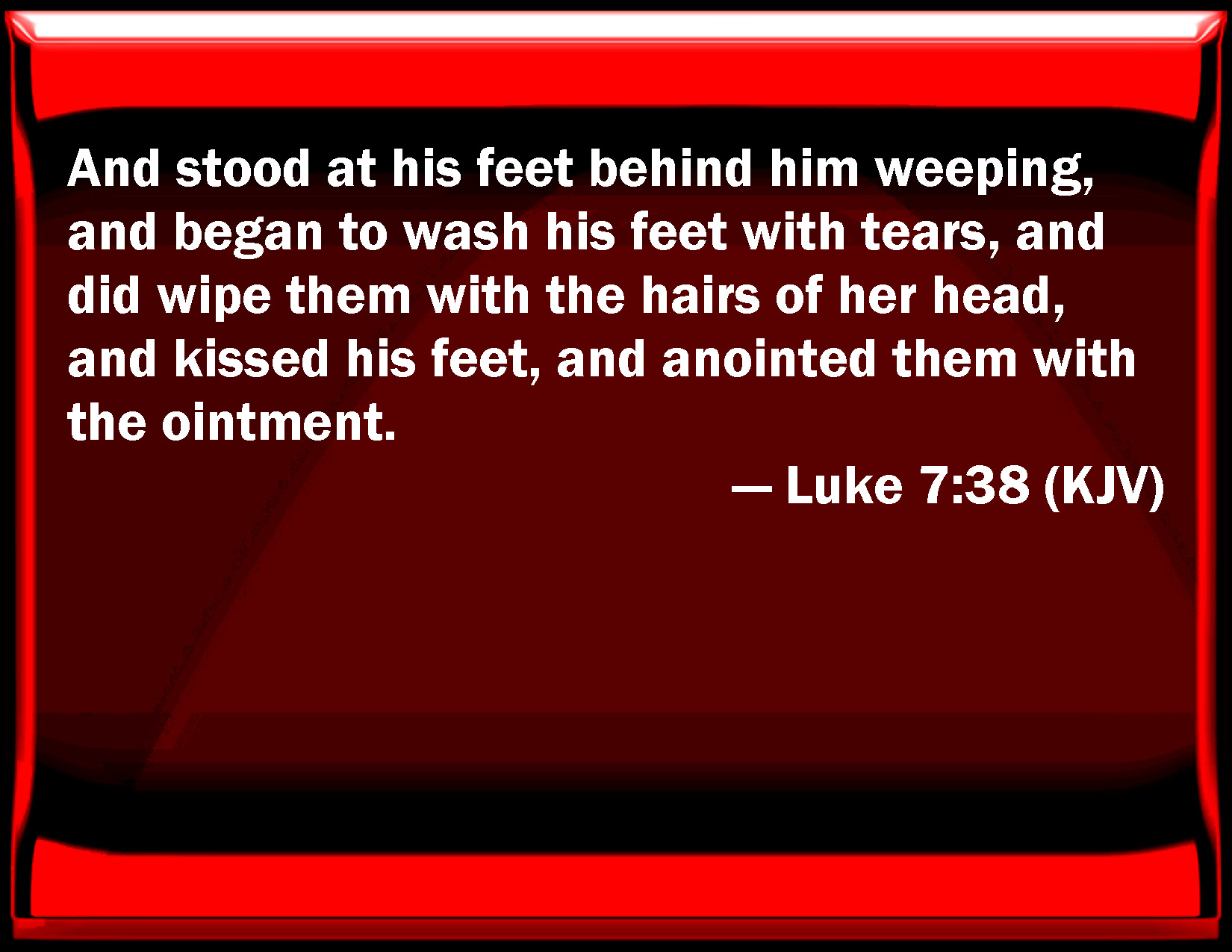 Bible Verse Slide Luke 7:38 And stood at his feet behind him weeping, and began to wash his feet with tears, and did wipe them with the hairs of her head, and kissed his feet, and anointed them with the ointment. KJV: And stood at his feet behind him weeping, and began to wash his feet with tears, and did wipe them with the hairs of her head, and kissed his feet, and anointed them with the ointment. DRB: And standing behind at his feet, she began to wash his feet, with tears, and wiped them with the hairs of her head, and kissed his feet, and anointed them with the ointment. DBT: and standing at his feet behind him weeping, began to wash his feet with tears; and she wiped them with the hairs of her head, and kissed his feet, and anointed them with the myrrh. ERV: and standing behind at his feet, weeping, she began to wet his feet with her tears, and wiped them with the hair of her head, and kissed his feet, and anointed them with the ointment. WBT: And stood at his feet behind him weeping, and began to wash his feet with tears, and wiped them with the hairs of her head, and kissed his feet, and anointed them with the ointment. WEB: Standing behind at his feet weeping, she began to wet his feet with her tears, and she wiped them with the hair of her head, kissed his feet, and anointed them with the ointment. YLT: and having stood behind, beside his feet, weeping, she began to wet his feet with the tears, and with the hairs of her head she was wiping, and was kissing his feet, and was anointing with the ointment.Links Luke 7:38 NIV • Luke 7:38 NLT • Luke 7:38 ESV • Luke 7:38 NASB • Luke 7:38 KJV • Luke 7:38 Interlinear • Luke 7:38 Commentaries • Luke 7:38 Parallel Texts • Luke 7:38 Bible Apps • Luke 7:38 Parallel • Bible Hub |