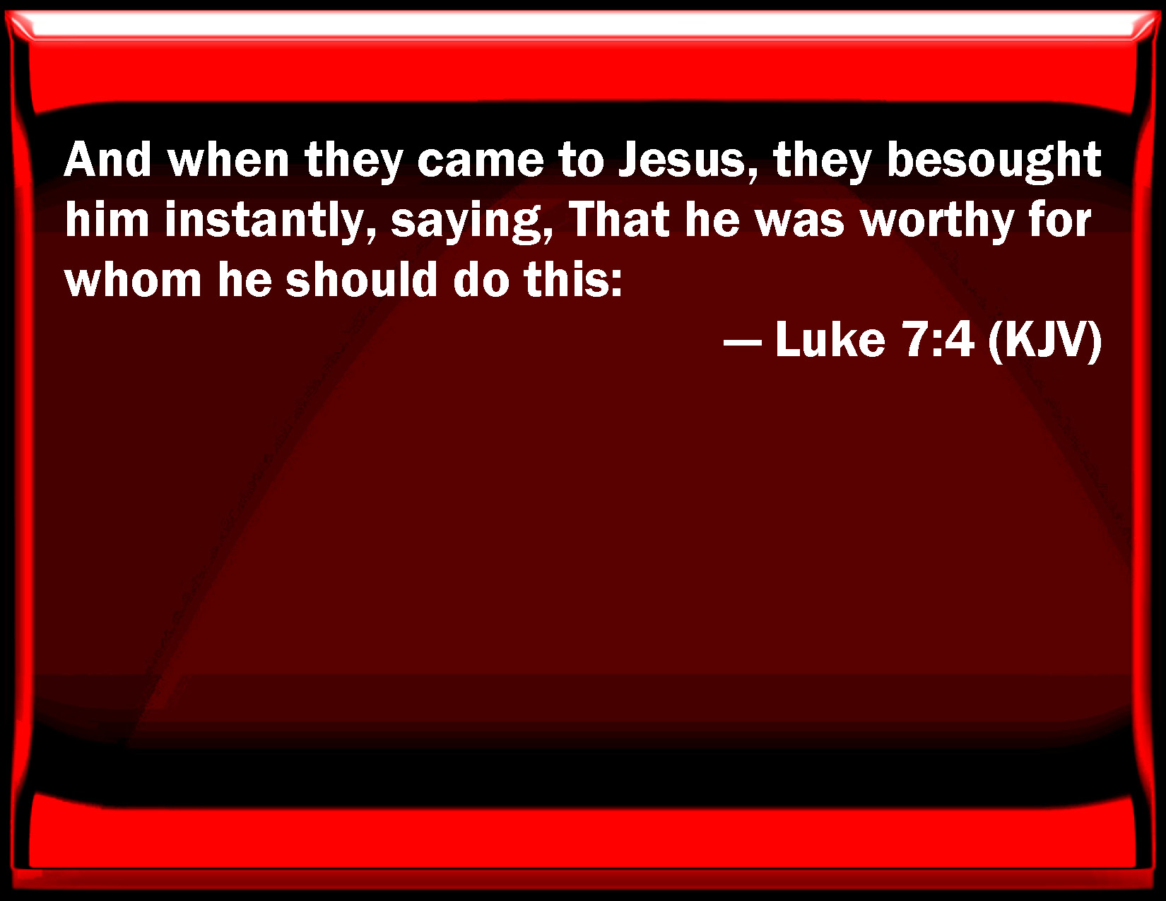 Bible Verse Slide Luke 7:4 And when they came to Jesus, they sought him instantly, saying, That he was worthy for whom he should do this: KJV: And when they came to Jesus, they besought him instantly, saying, That he was worthy for whom he should do this: DRB: And when they came to Jesus, they besought him earnestly, saying to him: He is worthy that thou shouldest do this for him. DBT: But they, being come to Jesus, besought him diligently, saying, He is worthy to whom thou shouldest grant this, ERV: And they, when they came to Jesus, besought him earnestly, saying, He is worthy that thou shouldest do this for him: WBT: And when they came to Jesus, they besought him earnestly, saying, That he was worthy for whom he should do this: WEB: When they came to Jesus, they begged him earnestly, saying, "He is worthy for you to do this for him, YLT: And they, having come near unto Jesus, were calling upon him earnestly, saying — 'He is worthy to whom thou shalt do this,Links Luke 7:4 NIV • Luke 7:4 NLT • Luke 7:4 ESV • Luke 7:4 NASB • Luke 7:4 KJV • Luke 7:4 Interlinear • Luke 7:4 Commentaries • Luke 7:4 Parallel Texts • Luke 7:4 Bible Apps • Luke 7:4 Parallel • Bible Hub |