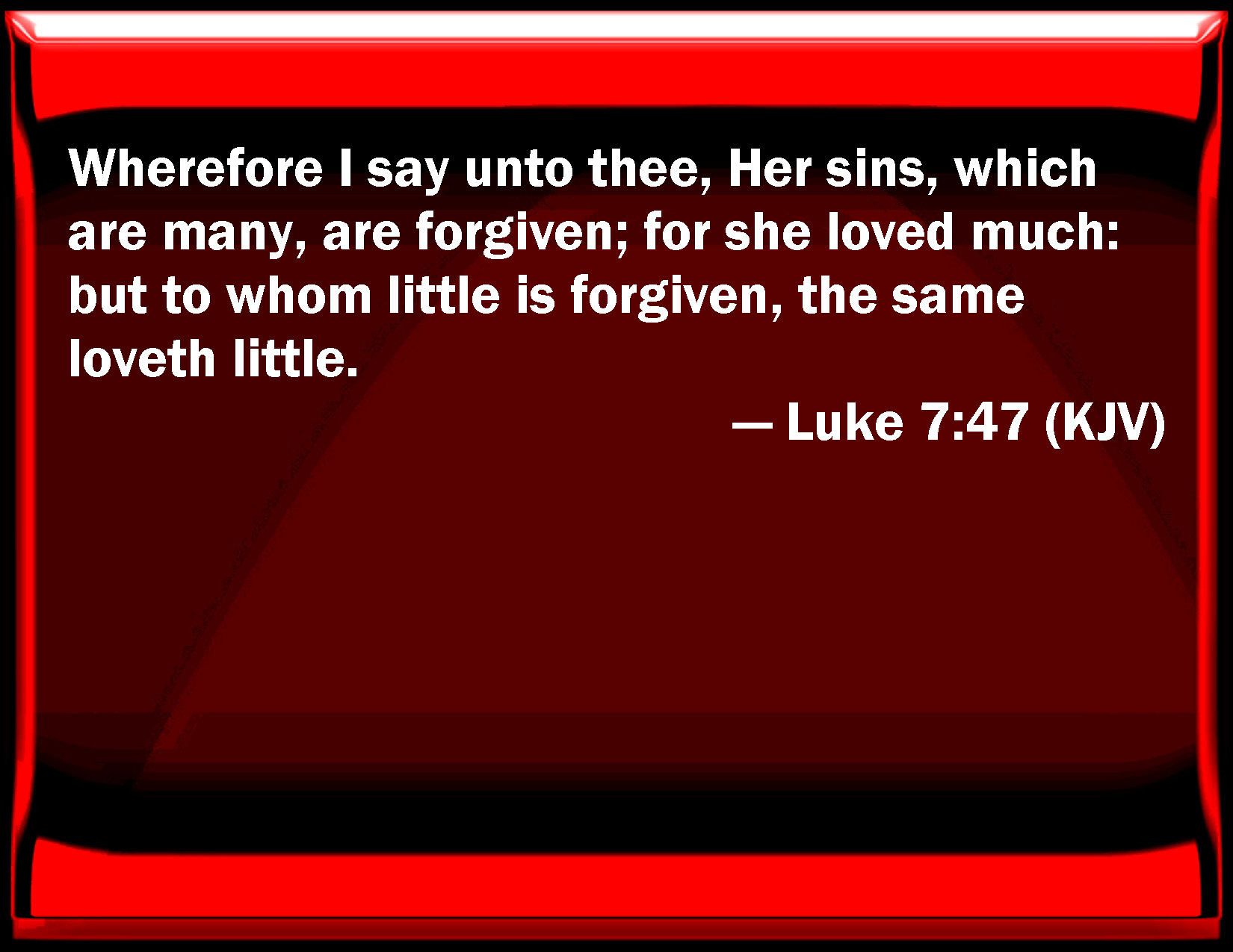 Bible Verse Slide Luke 7:47 Why I say to you, Her sins, which are many, are forgiven; for she loved much: but to whom little is forgiven, the same loves little. KJV: Wherefore I say unto thee, Her sins, which are many, are forgiven; for she loved much: but to whom little is forgiven, the same loveth little. DRB: Wherefore I say to thee: Many sins are forgiven her, because she hath loved much. But to whom less is forgiven, he loveth less. DBT: For which cause I say to thee, Her many sins are forgiven; for she loved much; but he to whom little is forgiven loves little. ERV: Wherefore I say unto thee, Her sins, which are many, are forgiven; for she loved much: but to whom little is forgiven, the same loveth little. WBT: Wherefore I say to thee, Her sins, which are many, are forgiven; for she loved much: but to whom little is forgiven, the same loveth little. WEB: Therefore I tell you, her sins, which are many, are forgiven, for she loved much. But to whom little is forgiven, the same loves little." YLT: therefore I say to thee, her many sins have been forgiven, because she did love much; but to whom little is forgiven, little he doth love.'Links Luke 7:47 NIV • Luke 7:47 NLT • Luke 7:47 ESV • Luke 7:47 NASB • Luke 7:47 KJV • Luke 7:47 Interlinear • Luke 7:47 Commentaries • Luke 7:47 Parallel Texts • Luke 7:47 Bible Apps • Luke 7:47 Parallel • Bible Hub |