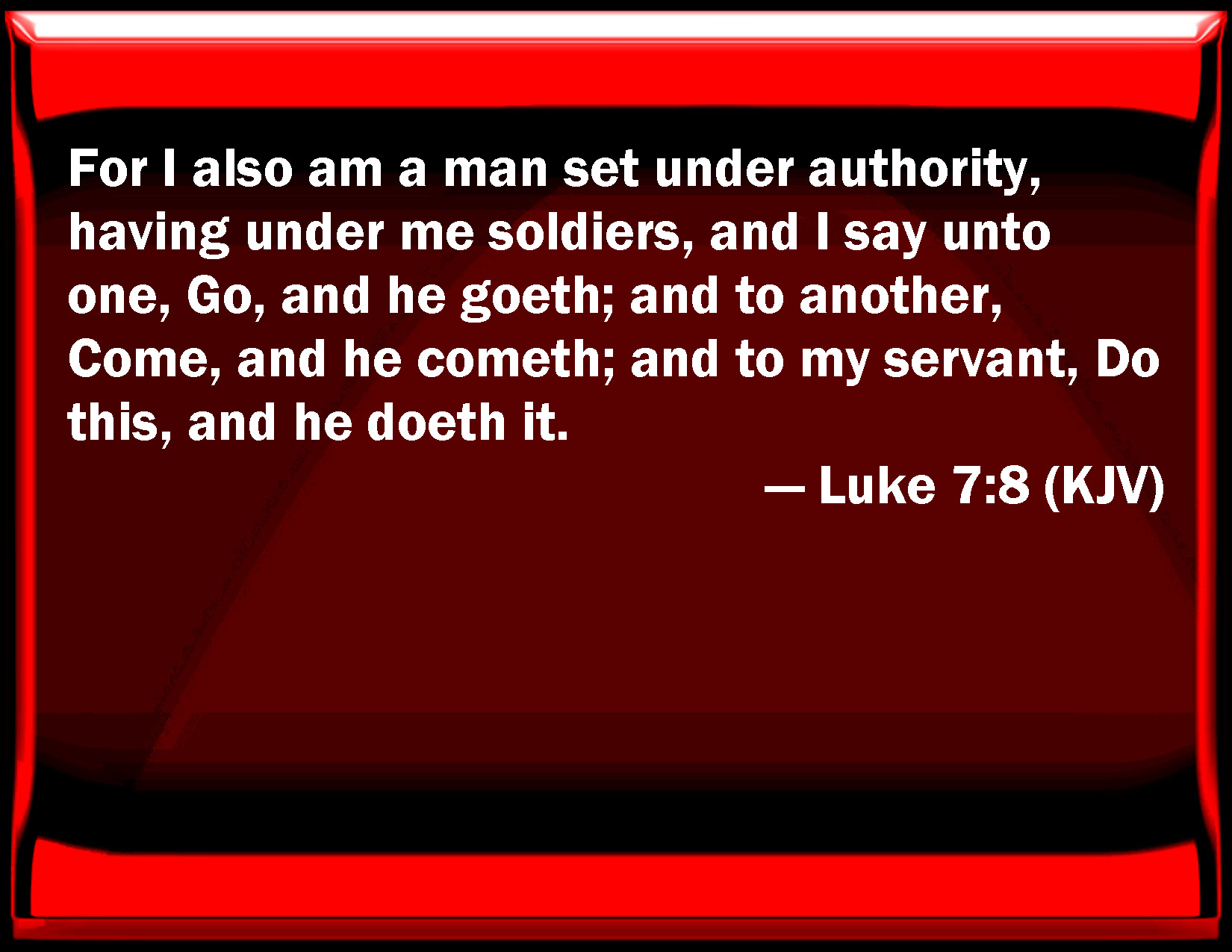Bible Verse Slide Luke 7:8 For I also am a man set under authority, having under me soldiers, and I say to one, Go, and he goes; and to another, Come, and he comes; and to my servant, Do this, and he does it. KJV: For I also am a man set under authority, having under me soldiers, and I say unto one, Go, and he goeth; and to another, Come, and he cometh; and to my servant, Do this, and he doeth it. DRB: For I also am a man subject to authority, having under me soldiers: and I say to one, Go, and he goeth; and to another, Come, and he cometh; and to my servant, Do this, and he doth it. DBT: For I also am a man placed under authority, having under myself soldiers, and I say to this one, Go, and he goes; and to another, Come, and he comes; and to my bondman, Do this, and he does it. ERV: For I also am a man set under authority, having under myself soldiers: and I say to this one, Go, and he goeth; and to another, Come, and he cometh; and to my servant, Do this, and he doeth it. WBT: For I also am a man set under authority, having under me soldiers, and I say to one, Go, and he goeth; and to another, Come, and he cometh; and to my servant, Do this, and he doeth it. WEB: For I also am a man placed under authority, having under myself soldiers. I tell this one, 'Go!' and he goes; and to another, 'Come!' and he comes; and to my servant, 'Do this,' and he does it." YLT: for I also am a man placed under authority, having under myself soldiers, and I say to this one, Go, and he goeth; and to another, Be coming, and he cometh; and to my servant, Do this, and he doth it.'Links Luke 7:8 NIV • Luke 7:8 NLT • Luke 7:8 ESV • Luke 7:8 NASB • Luke 7:8 KJV • Luke 7:8 Interlinear • Luke 7:8 Commentaries • Luke 7:8 Parallel Texts • Luke 7:8 Bible Apps • Luke 7:8 Parallel • Bible Hub |