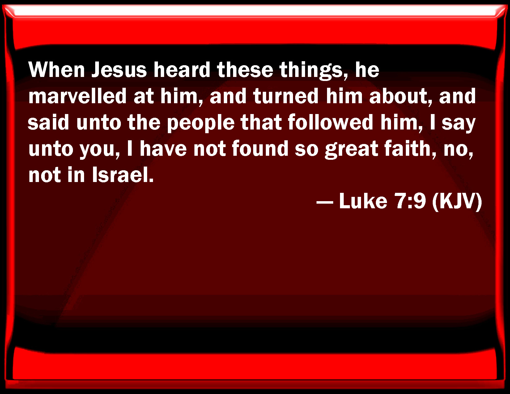Bible Verse Slide Luke 7:9 When Jesus heard these things, he marveled at him, and turned him about, and said to the people that followed him, I say to you, I have not found so great faith, no, not in Israel. KJV: When Jesus heard these things, he marvelled at him, and turned him about, and said unto the people that followed him, I say unto you, I have not found so great faith, no, not in Israel. DRB: Which Jesus hearing, marvelled: and turning about to the multitude that followed him, he said: Amen I say to you, I have not found so great faith, not even in Israel. DBT: And Jesus hearing this wondered at him, and turning to the crowd following him said, I say to you, Not even in Israel have I found so great faith. ERV: And when Jesus heard these things, he marveled at him, and turned and said unto the multitude that followed him, I say unto you, I have not found so great faith, no, not in Israel. WBT: When Jesus heard these things, he marveled at him, and turned himself about and said to the people that followed him, I say to you, I have not found so great faith, no, not in Israel. WEB: When Jesus heard these things, he marveled at him, and turned and said to the multitude who followed him, "I tell you, I have not found such great faith, no, not in Israel." YLT: And having heard these things Jesus wondered at him, and having turned to the multitude following him, he said, 'I say to you, not even in Israel so much faith did I find;'Links Luke 7:9 NIV • Luke 7:9 NLT • Luke 7:9 ESV • Luke 7:9 NASB • Luke 7:9 KJV • Luke 7:9 Interlinear • Luke 7:9 Commentaries • Luke 7:9 Parallel Texts • Luke 7:9 Bible Apps • Luke 7:9 Parallel • Bible Hub |