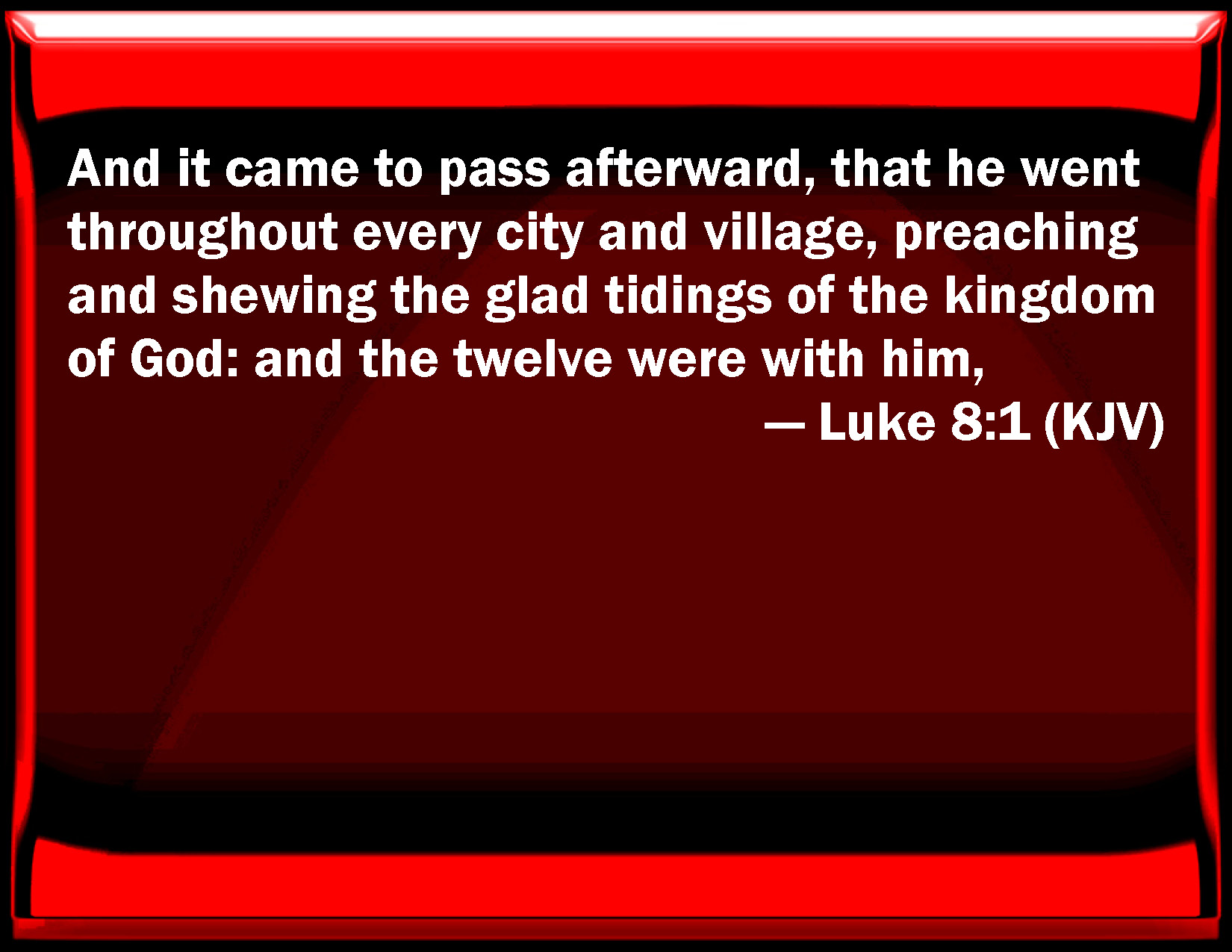 Bible Verse Slide Luke 8:1 And it came to pass afterward, that he went throughout every city and village, preaching and showing the glad tidings of the kingdom of God: and the twelve were with him, KJV: And it came to pass afterward, that he went throughout every city and village, preaching and shewing the glad tidings of the kingdom of God: and the twelve were with him, DRB: AND it came to pass afterwards, that he travelled through the cities and towns, preaching and evangelizing the kingdom of God; and the twelve with him: DBT: And it came to pass afterwards that he went through the country city by city, and village by village, preaching and announcing the glad tidings of the kingdom of God; and the twelve were with him, ERV: And it came to pass soon afterwards, that he went about through cities and villages, preaching and bringing the good tidings of the kingdom of God, and with him the twelve, WBT: And it came to pass afterward, that he went throughout every city and village, preaching and showing the glad tidings of the kingdom of God: and the twelve were with him, WEB: It happened soon afterwards, that he went about through cities and villages, preaching and bringing the good news of the Kingdom of God. With him were the twelve, YLT: And it came to pass thereafter, that he was going through every city and village, preaching and proclaiming good news of the reign of God, and the twelve are with him,Links Luke 8:1 NIV • Luke 8:1 NLT • Luke 8:1 ESV • Luke 8:1 NASB • Luke 8:1 KJV • Luke 8:1 Interlinear • Luke 8:1 Commentaries • Luke 8:1 Parallel Texts • Luke 8:1 Bible Apps • Luke 8:1 Parallel • Bible Hub |
