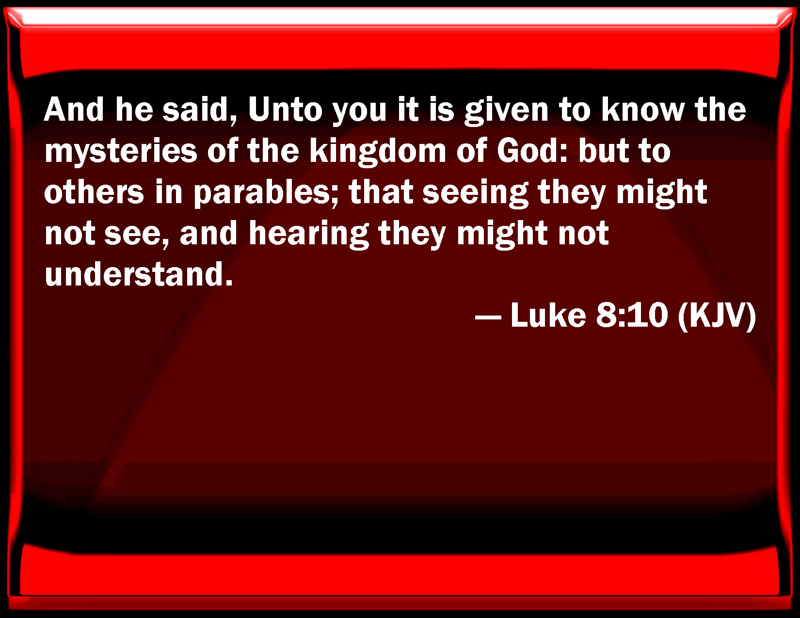 Bible Verse Slide Luke 8:10 And he said, To you it is given to know the mysteries of the kingdom of God: but to others in parables; that seeing they might not see, and hearing they might not understand. KJV: And he said, Unto you it is given to know the mysteries of the kingdom of God: but to others in parables; that seeing they might not see, and hearing they might not understand. DRB: To whom he said: To you it is given to know the mystery of the kingdom of God; but to the rest in parables, that seeing they may not see, and hearing may not understand. DBT: And he said, To you it is given to know the mysteries of the kingdom of God, but to the rest in parables, in order that seeing they may not see, and hearing they may not understand. ERV: And he said, Unto you it is given to know the mysteries of the kingdom of God: but to the rest in parables; that seeing they may not see, and hearing they may not understand. WBT: And he said, To you it is given to know the mysteries of the kingdom of God: but to others in parables; that seeing they may not see, and hearing they may not understand. WEB: He said, "To you it is given to know the mysteries of the Kingdom of God, but to the rest in parables; that 'seeing they may not see, and hearing they may not understand.' YLT: And he said, 'To you it hath been given to know the secrets of the reign of God, and to the rest in similes; that seeing they may not see, and hearing they may not understand.Links Luke 8:10 NIV • Luke 8:10 NLT • Luke 8:10 ESV • Luke 8:10 NASB • Luke 8:10 KJV • Luke 8:10 Interlinear • Luke 8:10 Commentaries • Luke 8:10 Parallel Texts • Luke 8:10 Bible Apps • Luke 8:10 Parallel • Bible Hub |