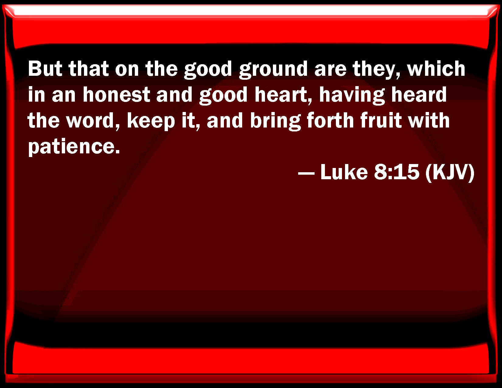 Bible Verse Slide Luke 8:15 But that on the good ground are they, which in an honest and good heart, having heard the word, keep it, and bring forth fruit with patience. KJV: But that on the good ground are they, which in an honest and good heart, having heard the word, keep it, and bring forth fruit with patience. DRB: But that on the good ground, are they who in a good and perfect heart, hearing the word, keep it, and bring forth fruit in patience. DBT: But that in the good ground, these are they who in an honest and good heart, having heard the word keep it, and bring forth fruit with patience. ERV: And that in the good ground, these are such as in an honest and good heart, having heard the word, hold it fast, and bring forth fruit with patience. WBT: But that on the good ground are they, who in an honest and good heart, having heard the word, keep it, and bring forth fruit with patience. WEB: That in the good ground, these are such as in an honest and good heart, having heard the word, hold it tightly, and bring forth fruit with patience. YLT: And that in the good ground: These are they, who in an upright and good heart, having heard the word, do retain it, and bear fruit in continuance.Links Luke 8:15 NIV • Luke 8:15 NLT • Luke 8:15 ESV • Luke 8:15 NASB • Luke 8:15 KJV • Luke 8:15 Interlinear • Luke 8:15 Commentaries • Luke 8:15 Parallel Texts • Luke 8:15 Bible Apps • Luke 8:15 Parallel • Bible Hub |