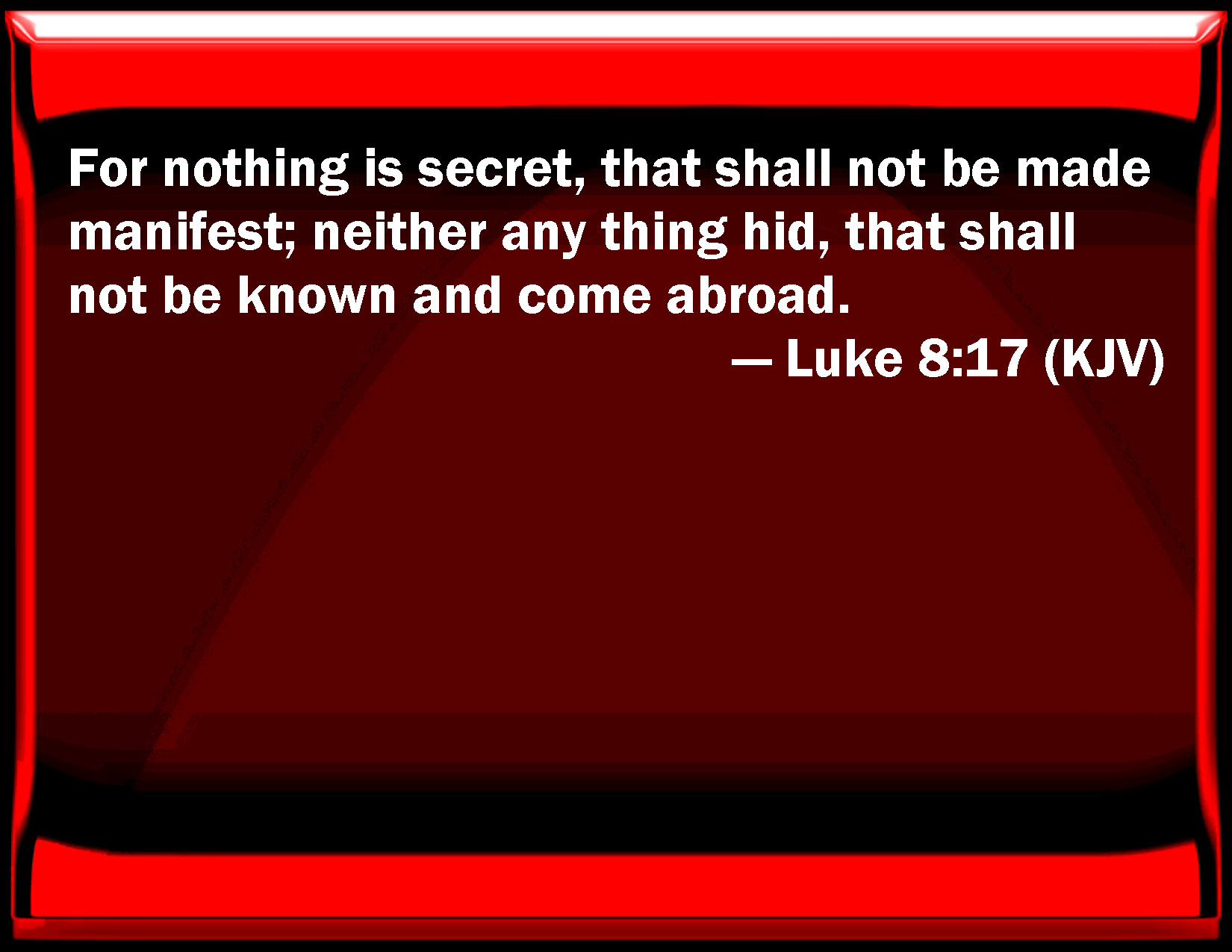 Bible Verse Slide Luke 8:17 For nothing is secret, that shall not be made manifest; neither any thing hid, that shall not be known and come abroad. KJV: For nothing is secret, that shall not be made manifest; neither any thing hid, that shall not be known and come abroad. DRB: For there is not any thing secret that shall not be made manifest, nor hidden, that shall not be known and come abroad. DBT: For there is nothing hid which shall not become manifest, nor secret which shall not be known and come to light. ERV: For nothing is hid, that shall not be made manifest; nor anything secret, that shall not be known and come to light. WBT: For nothing is secret, that shall not be made manifest; neither any thing hid, that shall not be known, and come abroad. WEB: For nothing is hidden, that will not be revealed; nor anything secret, that will not be known and come to light. YLT: for nothing is secret, that shall not become manifest, nor hid, that shall not be known, and become manifest.Links Luke 8:17 NIV • Luke 8:17 NLT • Luke 8:17 ESV • Luke 8:17 NASB • Luke 8:17 KJV • Luke 8:17 Interlinear • Luke 8:17 Commentaries • Luke 8:17 Parallel Texts • Luke 8:17 Bible Apps • Luke 8:17 Parallel • Bible Hub |