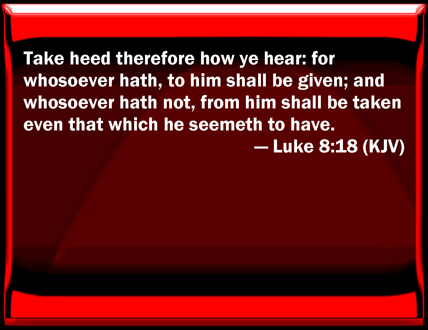 Bible Verse Slide Luke 8:18 Take heed therefore how you hear: for whoever has, to him shall be given; and whoever has not, from him shall be taken even that which he seems to have. KJV: Take heed therefore how ye hear: for whosoever hath, to him shall be given; and whosoever hath not, from him shall be taken even that which he seemeth to have. DRB: Take heed therefore how you hear. For whosoever hath, to him shall be given: and whosoever hath not, that also which he thinketh he hath, shall be taken away from him. DBT: Take heed therefore how ye hear; for whosoever has, to him shall be given, and whosoever has not, even what he seems to have shall be taken from him. ERV: Take heed therefore how ye hear: for whosoever hath, to him shall be given; and whosoever hath not, from him shall be taken away even that which he thinketh he hath. WBT: Take heed therefore how ye hear: for whoever hath, to him shall be given; and whoever hath not, from him shall be taken even that which he seemeth to have. WEB: Be careful therefore how you hear. For whoever has, to him will be given; and whoever doesn't have, from him will be taken away even that which he thinks he has." YLT: 'See, therefore, how ye hear, for whoever may have, there shall be given to him, and whoever may not have, also what he seemeth to have, shall be taken from him.'Links Luke 8:18 NIV • Luke 8:18 NLT • Luke 8:18 ESV • Luke 8:18 NASB • Luke 8:18 KJV • Luke 8:18 Interlinear • Luke 8:18 Commentaries • Luke 8:18 Parallel Texts • Luke 8:18 Bible Apps • Luke 8:18 Parallel • Bible Hub |