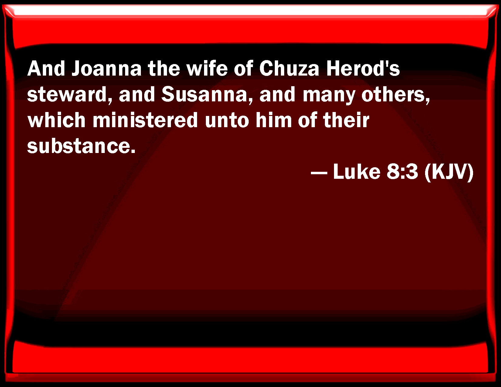 Bible Verse Slide Luke 8:3 And Joanna the wife of Chuza Herod's steward, and Susanna, and many others, which ministered to him of their substance. KJV: And Joanna the wife of Chuza Herod's steward, and Susanna, and many others, which ministered unto him of their substance. DRB: And Joanna the wife of Chusa, Herod's steward, and Susanna, and many others who ministered unto him of their substance. DBT: and Joanna, wife of Chuza, Herod's steward, and Susanna, and many others, who ministered to him of their substance. ERV: and Joanna the wife of Chuza Herod's steward, and Susanna, and many others, which ministered unto them of their substance. WBT: And Joanna the wife of Chuza Herod's steward, and Susanna, and many others, who ministered to him of their substance. WEB: and Joanna, the wife of Chuzas, Herod's steward; Susanna; and many others; who served them from their possessions. YLT: and Joanna wife of Chuza, steward of Herod, and Susanna, and many others, who were ministering to him from their substance.Links Luke 8:3 NIV • Luke 8:3 NLT • Luke 8:3 ESV • Luke 8:3 NASB • Luke 8:3 KJV • Luke 8:3 Interlinear • Luke 8:3 Commentaries • Luke 8:3 Parallel Texts • Luke 8:3 Bible Apps • Luke 8:3 Parallel • Bible Hub |