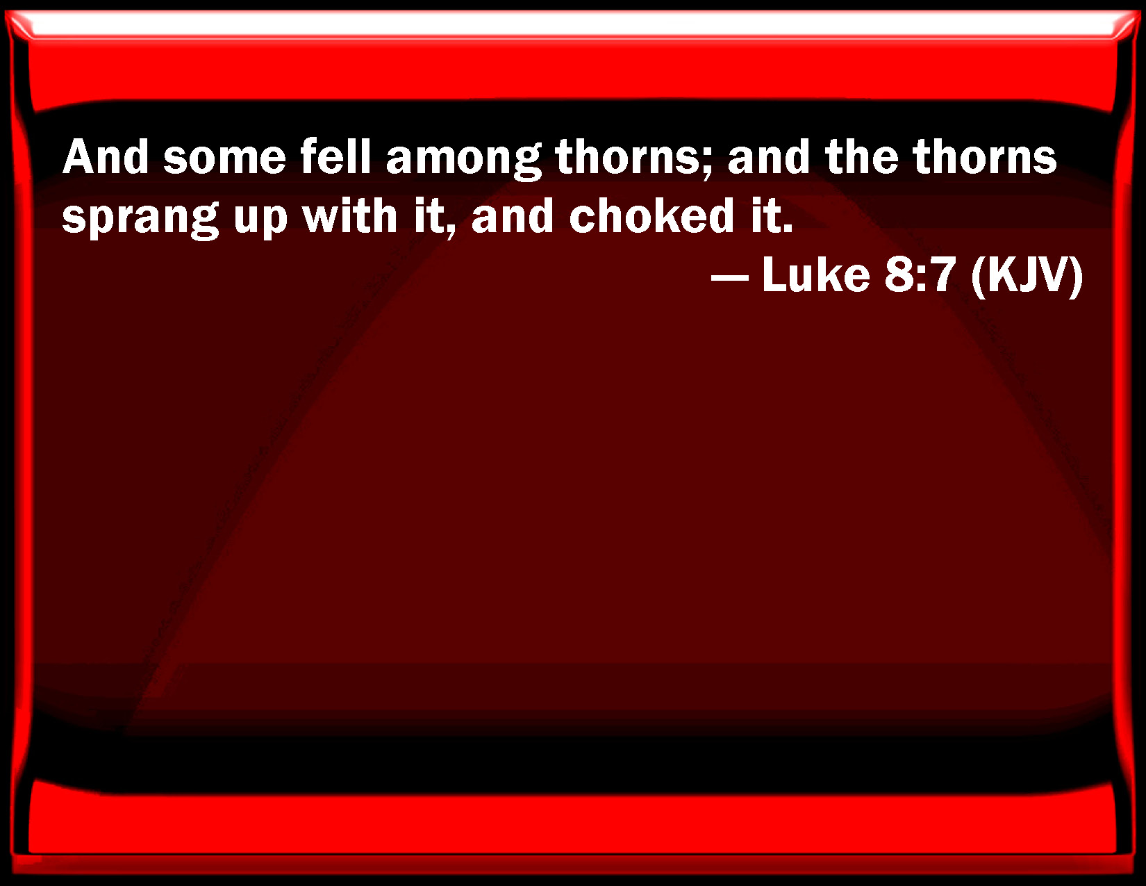 Bible Verse Slide Luke 8:7 And some fell among thorns; and the thorns sprang up with it, and choked it. KJV: And some fell among thorns; and the thorns sprang up with it, and choked it. DRB: And other some fell among thorns, and the thorns growing up with it, choked it. DBT: and other fell in the midst of the thorns, and the thorns having sprung up with it choked it; ERV: And other fell amidst the thorns; and the thorns grew with it, and choked it. WBT: And some fell among thorns; and the thorns sprang up with it, and choked it. WEB: Other fell amid the thorns, and the thorns grew with it, and choked it. YLT: 'And other fell amidst the thorns, and the thorns having sprung up with it, did choke it.Links Luke 8:7 NIV • Luke 8:7 NLT • Luke 8:7 ESV • Luke 8:7 NASB • Luke 8:7 KJV • Luke 8:7 Interlinear • Luke 8:7 Commentaries • Luke 8:7 Parallel Texts • Luke 8:7 Bible Apps • Luke 8:7 Parallel • Bible Hub |