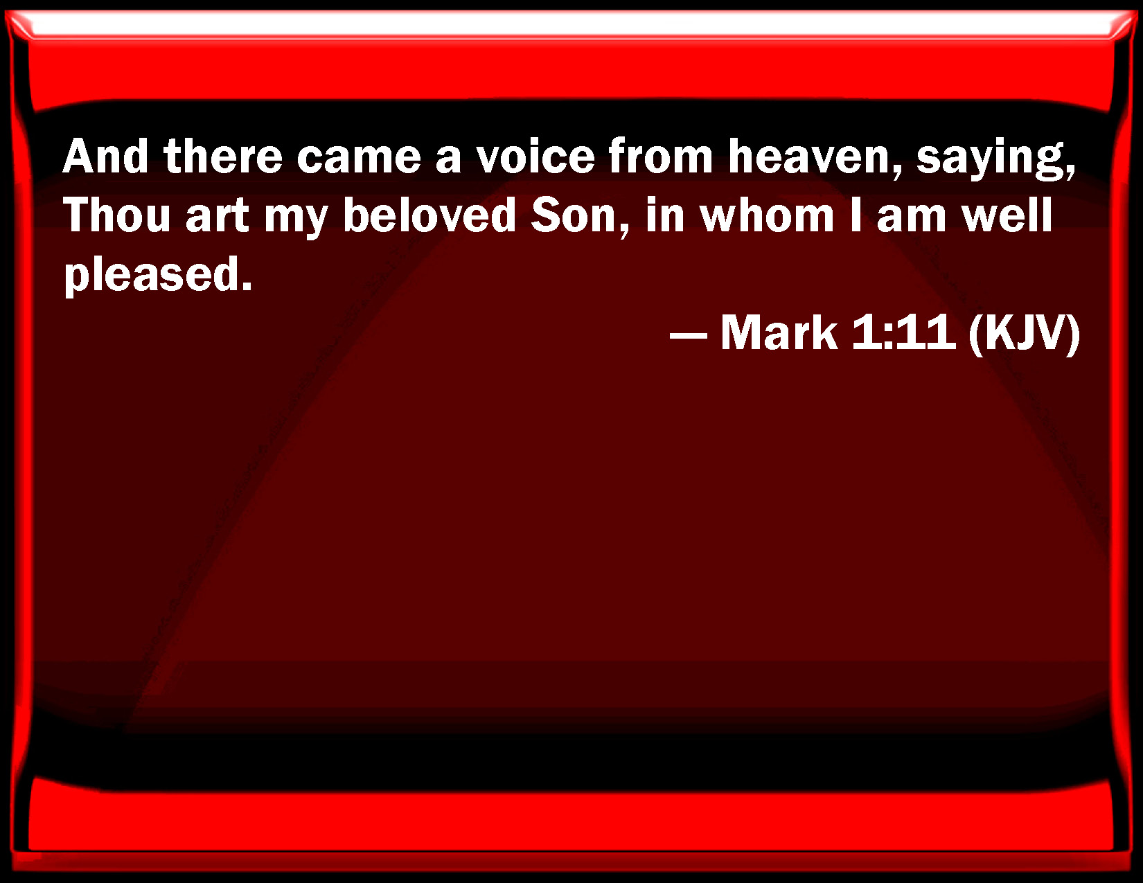 Bible Verse Slide Mark 1:11 And there came a voice from heaven, saying, You are my beloved Son, in whom I am well pleased. KJV: And there came a voice from heaven, saying, Thou art my beloved Son, in whom I am well pleased. DRB: And there came a voice from heaven: Thou art my beloved Son; in thee I am well pleased. DBT: And there came a voice out of the heavens: Thou art my beloved Son, in thee I have found my delight. ERV: And a voice came out of the heavens, Thou art my beloved Son, in thee I am well pleased. WBT: And there came a voice from heaven, saying, Thou art my beloved Son, in whom I am well pleased. WEB: A voice came out of the sky, "You are my beloved Son, in whom I am well pleased." YLT: and a voice came out of the heavens, 'Thou art My Son — the Beloved, in whom I did delight.'Links Mark 1:11 NIV • Mark 1:11 NLT • Mark 1:11 ESV • Mark 1:11 NASB • Mark 1:11 KJV • Mark 1:11 Interlinear • Mark 1:11 Commentaries • Mark 1:11 Parallel Texts • Mark 1:11 Bible Apps • Mark 1:11 Parallel • Bible Hub |