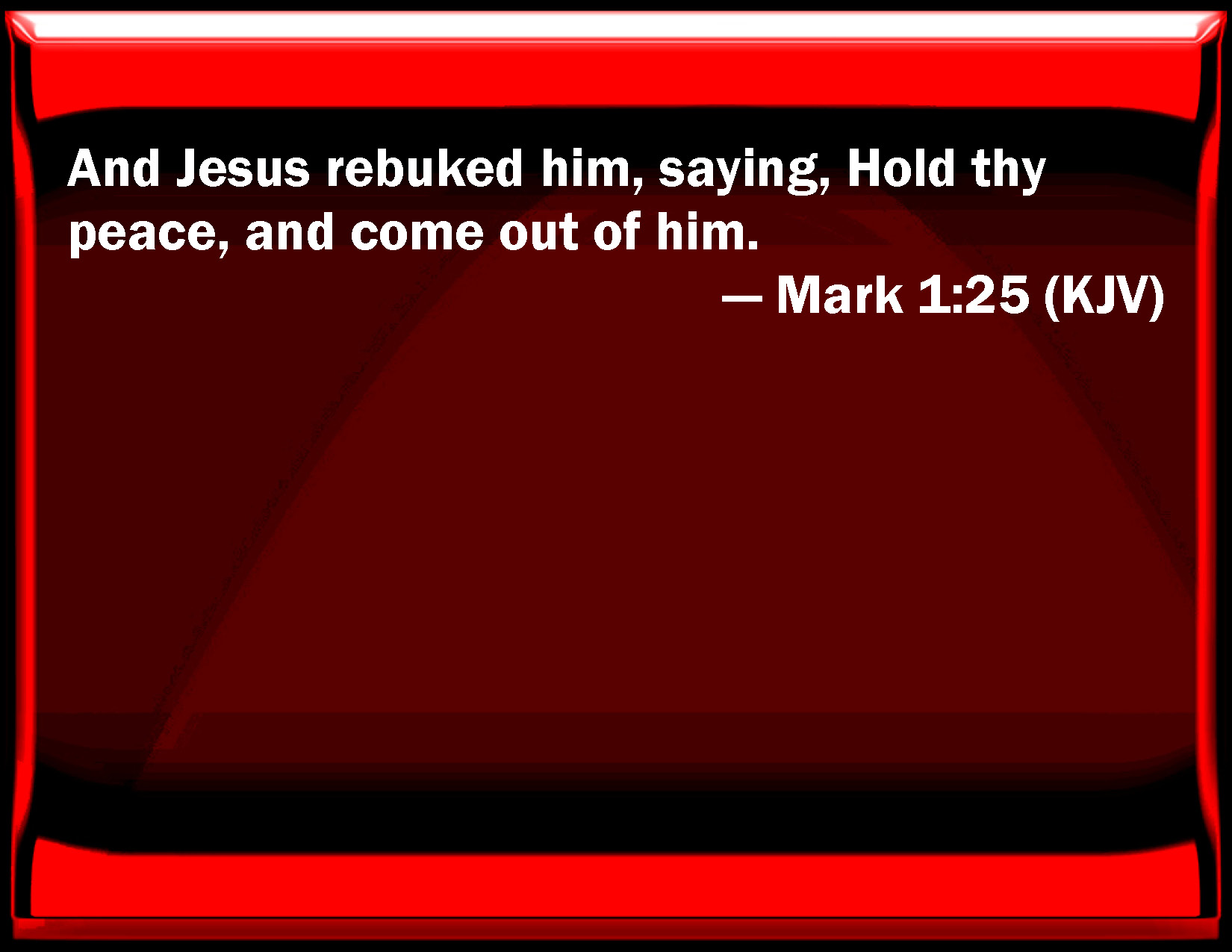 Bible Verse Slide Mark 1:25 And Jesus rebuked him, saying, Hold your peace, and come out of him. KJV: And Jesus rebuked him, saying, Hold thy peace, and come out of him. DRB: And Jesus threatened him, saying: Speak no more, and go out of the man. DBT: And Jesus rebuked him, saying, Hold thy peace and come out of him. ERV: And Jesus rebuked him, saying, Hold thy peace, and come out of him. WBT: And Jesus rebuked him, saying, Hold thy peace, and come out of him. WEB: Jesus rebuked him, saying, "Be quiet, and come out of him!" YLT: And Jesus rebuked him, saying, 'Be silenced, and come forth out of him,'Links Mark 1:25 NIV • Mark 1:25 NLT • Mark 1:25 ESV • Mark 1:25 NASB • Mark 1:25 KJV • Mark 1:25 Interlinear • Mark 1:25 Commentaries • Mark 1:25 Parallel Texts • Mark 1:25 Bible Apps • Mark 1:25 Parallel • Bible Hub |