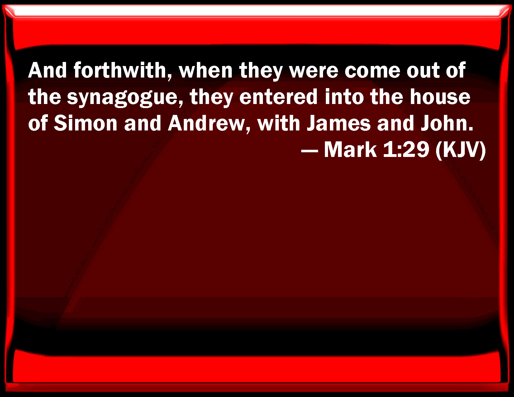 Bible Verse Slide Mark 1:29 And immediately, when they were come out of the synagogue, they entered into the house of Simon and Andrew, with James and John. KJV: And forthwith, when they were come out of the synagogue, they entered into the house of Simon and Andrew, with James and John. DRB: And immediately going out of the synagogue they came into the house of Simon and Andrew, with James and John. DBT: And straightway going out of the synagogue, they came with James and John into the house of Simon and Andrew. ERV: And straightway, when they were come out of the synagogue, they came into the house of Simon and Andrew, with James and John. WBT: And forthwith, when they had come out of the synagogue, they entered into the house of Simon and Andrew, with James and John. WEB: Immediately, when they had come out of the synagogue, they came into the house of Simon and Andrew, with James and John. YLT: And immediately, having come forth out of the synagogue, they went to the house of Simon and Andrew, with James and John,Links Mark 1:29 NIV • Mark 1:29 NLT • Mark 1:29 ESV • Mark 1:29 NASB • Mark 1:29 KJV • Mark 1:29 Interlinear • Mark 1:29 Commentaries • Mark 1:29 Parallel Texts • Mark 1:29 Bible Apps • Mark 1:29 Parallel • Bible Hub |