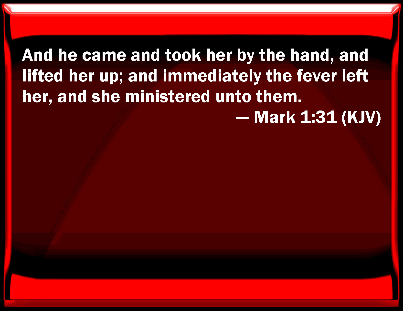 Bible Verse Slide Mark 1:31 And he came and took her by the hand, and lifted her up; and immediately the fever left her, and she ministered to them. KJV: And he came and took her by the hand, and lifted her up; and immediately the fever left her, and she ministered unto them. DRB: And coming to her, he lifted her up, taking her by the hand; and immediately the fever left her, and she ministered unto them. DBT: And he went up to her and raised her up, having taken her by the hand, and straightway the fever left her, and she served them. ERV: and he came and took her by the hand, and raised her up; and the fever left her, and she ministered unto them. WBT: And he came and took her by the hand, and lifted her up; and immediately the fever left her, and she ministered to them. WEB: He came and took her by the hand, and raised her up. The fever left her, and she served them. YLT: and having come near, he raised her up, having laid hold of her hand, and the fever left her immediately, and she was ministering to them.Links Mark 1:31 NIV • Mark 1:31 NLT • Mark 1:31 ESV • Mark 1:31 NASB • Mark 1:31 KJV • Mark 1:31 Interlinear • Mark 1:31 Commentaries • Mark 1:31 Parallel Texts • Mark 1:31 Bible Apps • Mark 1:31 Parallel • Bible Hub |