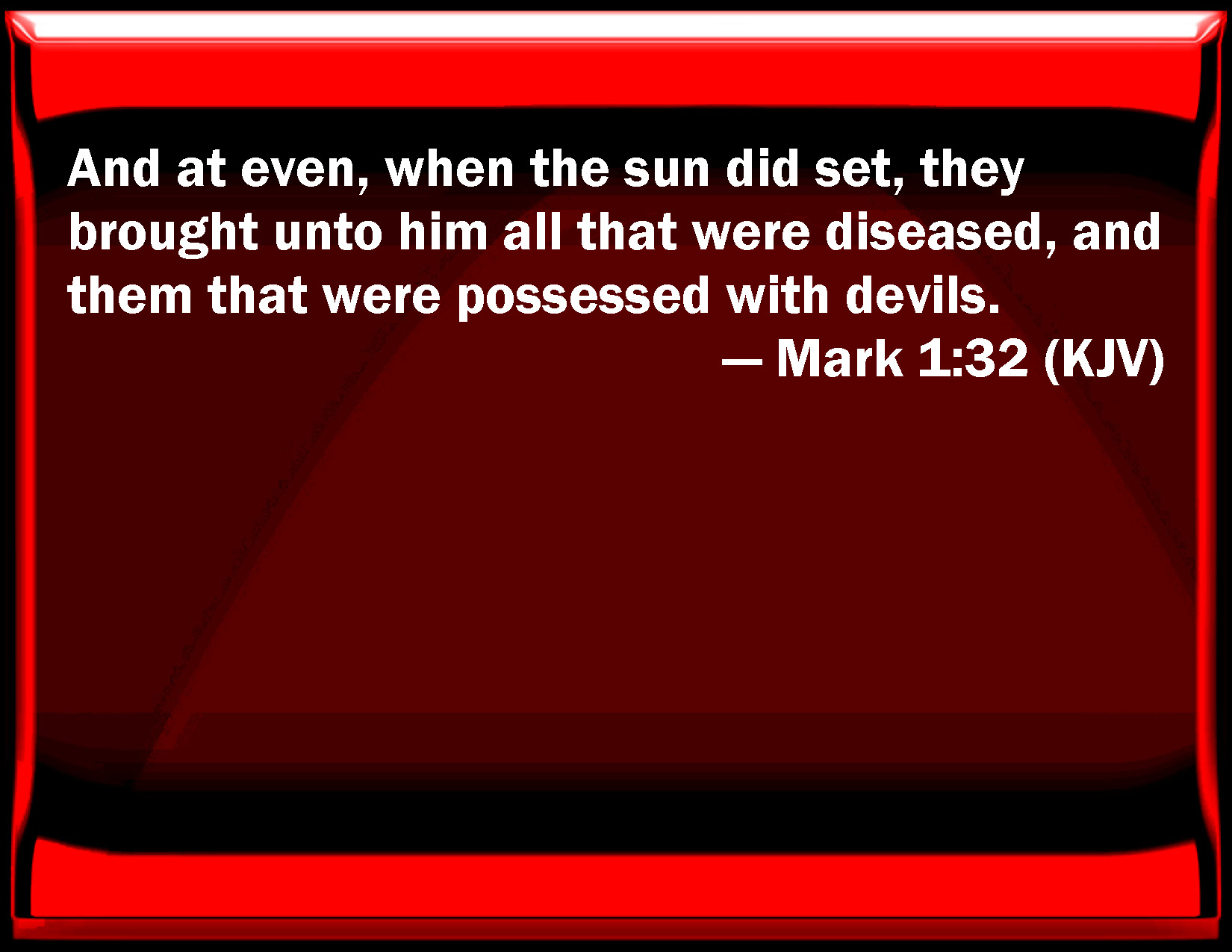 Bible Verse Slide Mark 1:32 And at even, when the sun did set, they brought to him all that were diseased, and them that were possessed with devils. KJV: And at even, when the sun did set, they brought unto him all that were diseased, and them that were possessed with devils. DRB: And when it was evening, after sunset, they brought to him all that were ill and that were possessed with devils. DBT: But evening being come, when the sun had gone down, they brought to him all that were suffering, and those possessed by demons; ERV: And at even, when the sun did set, they brought unto him all that were sick, and them that were possessed with devils. WBT: And at evening, when the sun had set, they brought to him all that were diseased, and them that were possessed with demons. WEB: At evening, when the sun had set, they brought to him all who were sick, and those who were possessed by demons. YLT: And evening having come, when the sun did set, they brought unto him all who were ill, and who were demoniacs,Links Mark 1:32 NIV • Mark 1:32 NLT • Mark 1:32 ESV • Mark 1:32 NASB • Mark 1:32 KJV • Mark 1:32 Interlinear • Mark 1:32 Commentaries • Mark 1:32 Parallel Texts • Mark 1:32 Bible Apps • Mark 1:32 Parallel • Bible Hub |
