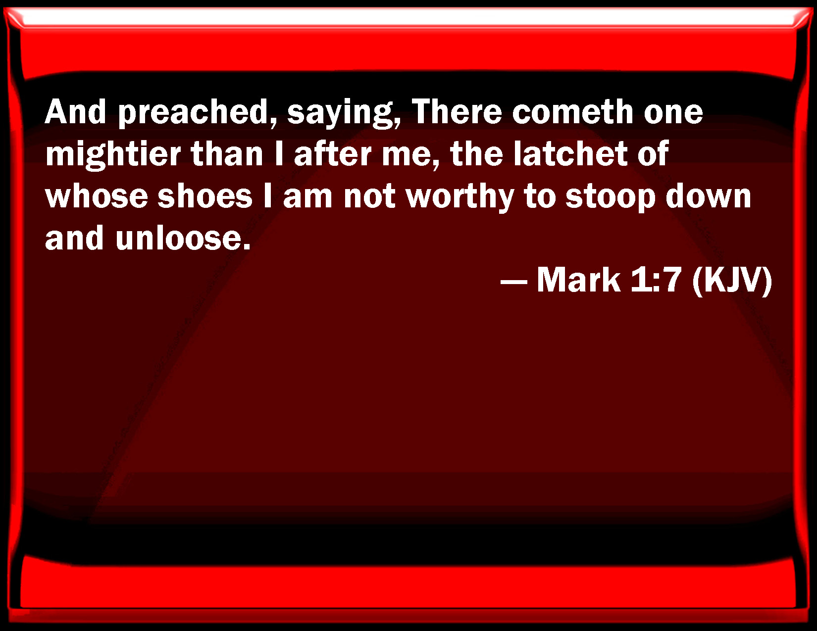 Bible Verse Slide Mark 1:7 And preached, saying, There comes one mightier than I after me, the lace of whose shoes I am not worthy to stoop down and unloose. KJV: And preached, saying, There cometh one mightier than I after me, the latchet of whose shoes I am not worthy to stoop down and unloose. DRB: And he preached, saying: There cometh after me one mightier than I, the latchet of whose shoes I am not worthy to stoop down and loose. DBT: And he preached, saying, There comes he that is mightier than I after me, the thong of whose sandals I am not fit to stoop down and unloose. ERV: And he preached, saying, There cometh after me he that is mightier than I, the latchet of whose shoes I am not worthy to stoop down and unloose. WBT: And preached, saying, There cometh after me one mightier than I, the latchet of whose shoes I am not worthy to stoop down and unloose. WEB: He preached, saying, "After me comes he who is mightier than I, the thong of whose sandals I am not worthy to stoop down and loosen. YLT: and he proclaimed, saying, 'He doth come — who is mightier than I — after me, of whom I am not worthy — having stooped down — to loose the latchet of his sandals;Links Mark 1:7 NIV • Mark 1:7 NLT • Mark 1:7 ESV • Mark 1:7 NASB • Mark 1:7 KJV • Mark 1:7 Interlinear • Mark 1:7 Commentaries • Mark 1:7 Parallel Texts • Mark 1:7 Bible Apps • Mark 1:7 Parallel • Bible Hub |