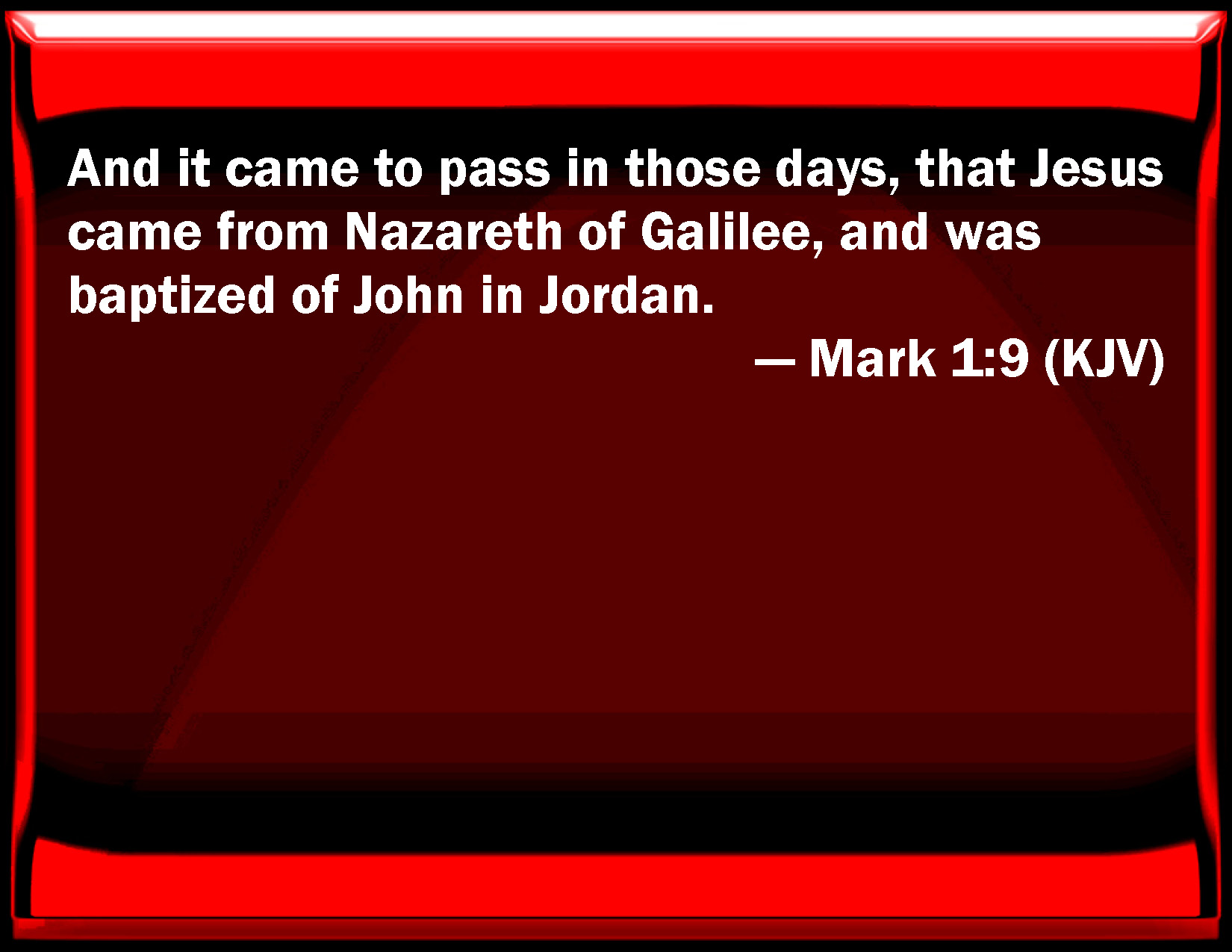 Bible Verse Slide Mark 1:9 And it came to pass in those days, that Jesus came from Nazareth of Galilee, and was baptized of John in Jordan. KJV: And it came to pass in those days, that Jesus came from Nazareth of Galilee, and was baptized of John in Jordan. DRB: And it came to pass, in those days, Jesus came from Nazareth of Galilee, and was baptized by John in the Jordan. DBT: And it came to pass in those days that Jesus came from Nazareth of Galilee, and was baptised by John at the Jordan. ERV: And it came to pass in those days, that Jesus came from Nazareth of Galilee, and was baptized of John in the Jordan. WBT: And it came to pass in those days, that Jesus came from Nazareth to Galilee, and was baptized by John in Jordan. WEB: It happened in those days, that Jesus came from Nazareth of Galilee, and was baptized by John in the Jordan. YLT: And it came to pass in those days, Jesus came from Nazareth of Galilee, and was baptized by John at the Jordan;Links Mark 1:9 NIV • Mark 1:9 NLT • Mark 1:9 ESV • Mark 1:9 NASB • Mark 1:9 KJV • Mark 1:9 Interlinear • Mark 1:9 Commentaries • Mark 1:9 Parallel Texts • Mark 1:9 Bible Apps • Mark 1:9 Parallel • Bible Hub |