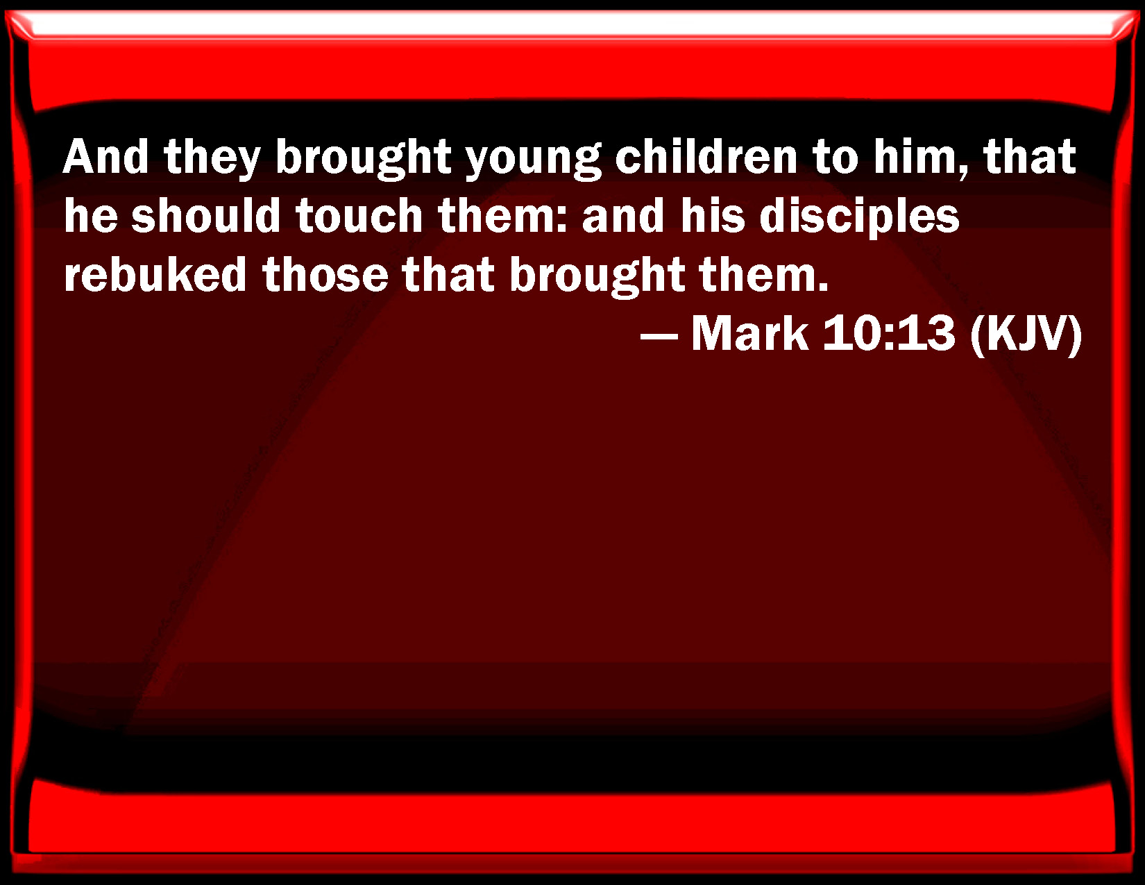 Bible Verse Slide Mark 10:13 And they brought young children to him, that he should touch them: and his disciples rebuked those that brought them. KJV: And they brought young children to him, that he should touch them: and his disciples rebuked those that brought them. DRB: And they brought to him young children, that he might touch them. And the disciples rebuked them that brought them. DBT: And they brought little children to him that he might touch them. But the disciples rebuked those that brought them. ERV: And they brought unto him little children, that he should touch them: and the disciples rebuked them. WBT: And they brought young children to him, that he should touch them; and his disciples rebuked those that brought them. WEB: They were bringing to him little children, that he should touch them, but the disciples rebuked those who were bringing them. YLT: And they were bringing to him children, that he might touch them, and the disciples were rebuking those bringing them,Links Mark 10:13 NIV • Mark 10:13 NLT • Mark 10:13 ESV • Mark 10:13 NASB • Mark 10:13 KJV • Mark 10:13 Interlinear • Mark 10:13 Commentaries • Mark 10:13 Parallel Texts • Mark 10:13 Bible Apps • Mark 10:13 Parallel • Bible Hub |