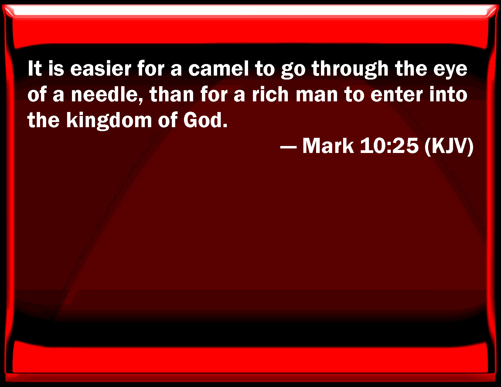 Mark 10:25 It is easier for a camel to go through the eye of a needle, than for a rich man to enter into the kingdom of God.