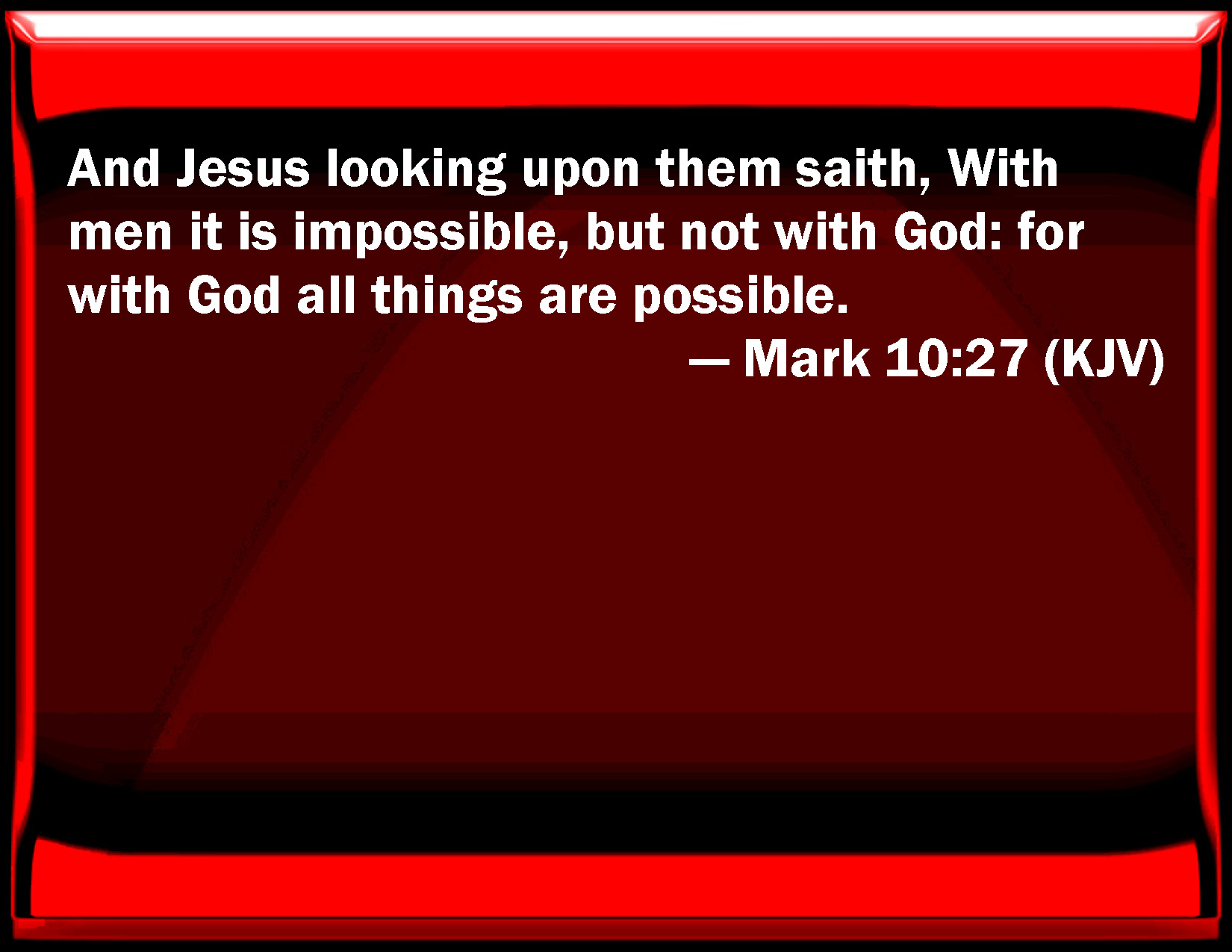 Bible Verse Slide Mark 10:27 And Jesus looking on them said, With men it is impossible, but not with God: for with God all things are possible. KJV: And Jesus looking upon them saith, With men it is impossible, but not with God: for with God all things are possible. DRB: And Jesus looking on them, saith: With men it is impossible; but not with God: for all things are possible with God. DBT: But Jesus looking on them says, With men it is impossible, but not with God; for all things are possible with God. ERV: Jesus looking upon them saith, With men it is impossible, but not with God: for all things are possible with God. WBT: And Jesus looking upon them, saith, With men it is impossible, but not with God: for with God all things are possible. WEB: Jesus, looking at them, said, "With men it is impossible, but not with God, for all things are possible with God." YLT: And Jesus, having looked upon them, saith, 'With men it is impossible, but not with God; for all things are possible with God.'Links Mark 10:27 NIV • Mark 10:27 NLT • Mark 10:27 ESV • Mark 10:27 NASB • Mark 10:27 KJV • Mark 10:27 Interlinear • Mark 10:27 Commentaries • Mark 10:27 Parallel Texts • Mark 10:27 Bible Apps • Mark 10:27 Parallel • Bible Hub |