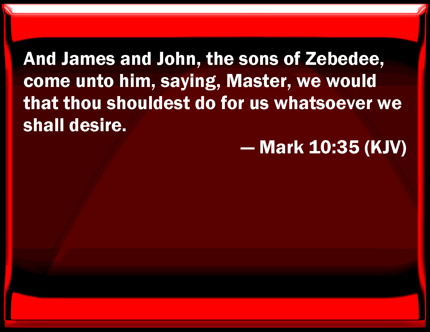 Bible Verse Slide Mark 10:35 And James and John, the sons of Zebedee, come to him, saying, Master, we would that you should do for us whatever we shall desire. KJV: And James and John, the sons of Zebedee, come unto him, saying, Master, we would that thou shouldest do for us whatsoever we shall desire. DRB: And James and John the sons of Zebedee, come to him, saying: Master, we desire that whatsoever we shall ask, thou wouldst do it for us: DBT: And there come to him James and John, the sons of Zebedee, saying to him, Teacher, we would that whatsoever we may ask thee, thou wouldst do it for us. ERV: And there come near unto him James and John, the sons of Zebedee, saying unto him, Master, we would that thou shouldest do for us whatsoever we shall ask of thee. WBT: And James and John the sons of Zebedee come to him, saying, Master, we would that thou shouldest do for us whatever we shall desire. WEB: James and John, the sons of Zebedee, came near to him, saying, "Teacher, we want you to do for us whatever we will ask." YLT: And there come near to him James and John, the sons of Zebedee, saying, 'Teacher, we wish that whatever we may ask for ourselves, thou mayest do for us;'Links Mark 10:35 NIV • Mark 10:35 NLT • Mark 10:35 ESV • Mark 10:35 NASB • Mark 10:35 KJV • Mark 10:35 Interlinear • Mark 10:35 Commentaries • Mark 10:35 Parallel Texts • Mark 10:35 Bible Apps • Mark 10:35 Parallel • Bible Hub |