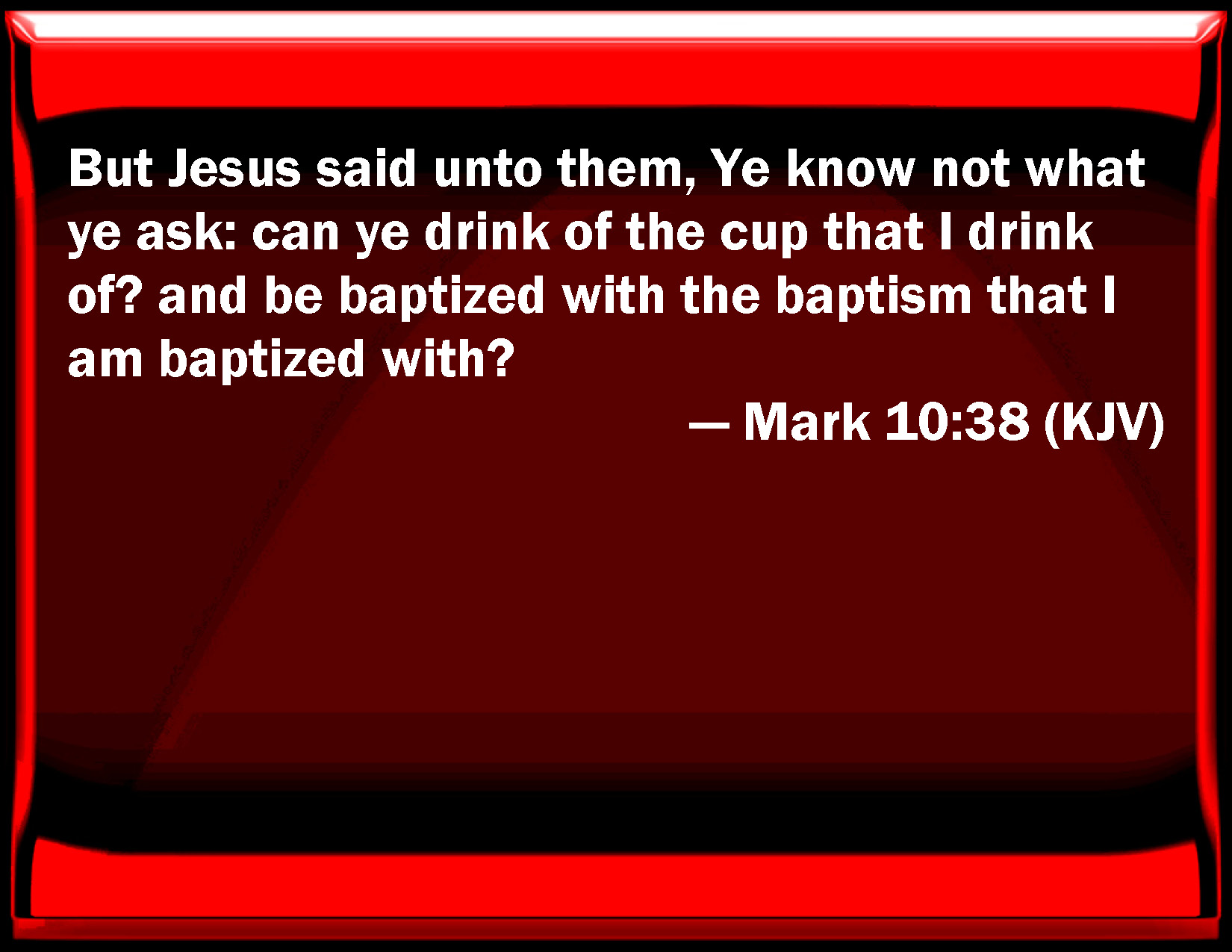 Bible Verse Slide Mark 10:38 But Jesus said to them, You know not what you ask: can you drink of the cup that I drink of? and be baptized with the baptism that I am baptized with? KJV: But Jesus said unto them, Ye know not what ye ask: can ye drink of the cup that I drink of? and be baptized with the baptism that I am baptized with? DRB: And Jesus said to them: You know not what you ask. Can you drink of the chalice that I drink of: or be baptized with the baptism wherewith I am baptized? DBT: And Jesus said to them, Ye do not know what ye ask. Are ye able to drink the cup which I drink, or be baptised with the baptism that I am baptised with? ERV: But Jesus said unto them, Ye know not what ye ask. Are ye able to drink the cup that I drink? or to be baptized with the baptism that I am baptized with? WBT: But Jesus said to them, Ye know not what ye ask: can ye drink of the cup that I drink of? and be baptized with the baptism that I am baptized with? WEB: But Jesus said to them, "You don't know what you are asking. Are you able to drink the cup that I drink, and to be baptized with the baptism that I am baptized with?" YLT: and Jesus said to them, 'Ye have not known what ye ask; are ye able to drink of the cup that I drink of, and with the baptism that I am baptized with — to be baptized?'Links Mark 10:38 NIV • Mark 10:38 NLT • Mark 10:38 ESV • Mark 10:38 NASB • Mark 10:38 KJV • Mark 10:38 Interlinear • Mark 10:38 Commentaries • Mark 10:38 Parallel Texts • Mark 10:38 Bible Apps • Mark 10:38 Parallel • Bible Hub |