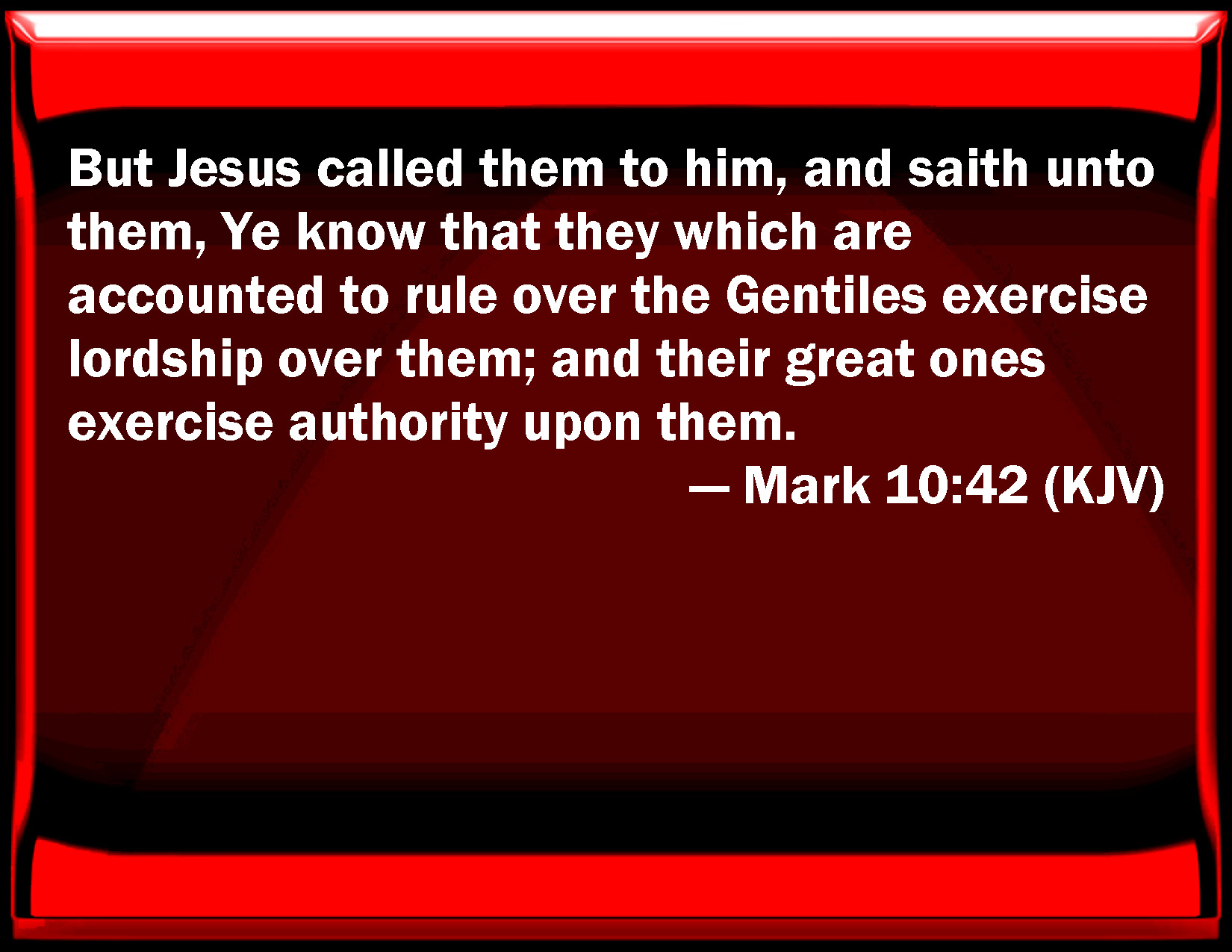 Bible Verse Slide Mark 10:42 But Jesus called them to him, and said to them, You know that they which are accounted to rule over the Gentiles exercise lordship over them; and their great ones exercise authority on them. KJV: But Jesus called them to him, and saith unto them, Ye know that they which are accounted to rule over the Gentiles exercise lordship over them; and their great ones exercise authority upon them. DRB: But Jesus calling them, saith to them: You know that they who seem to rule over the Gentiles, lord it over them: and their princes have power over them. DBT: But Jesus having called them to him, says to them, Ye know that those who are esteemed to rule over the nations exercise lordship over them; and their great men exercise authority over them; ERV: And Jesus called them to him, and saith unto them, Ye know that they which are accounted to rule over the Gentiles lord it over them; and their great ones exercise authority over them. WBT: But Jesus called them, and saith to them, Ye know that they who are accounted to rule over the Gentiles, exercise lordship over them; and their great ones exercise authority upon them. WEB: Jesus summoned them, and said to them, "You know that they who are recognized as rulers over the nations lord it over them, and their great ones exercise authority over them. YLT: but Jesus having called them near, saith to them, 'Ye have known that they who are considered to rule the nations do exercise lordship over them, and their great ones do exercise authority upon them;Links Mark 10:42 NIV • Mark 10:42 NLT • Mark 10:42 ESV • Mark 10:42 NASB • Mark 10:42 KJV • Mark 10:42 Interlinear • Mark 10:42 Commentaries • Mark 10:42 Parallel Texts • Mark 10:42 Bible Apps • Mark 10:42 Parallel • Bible Hub |