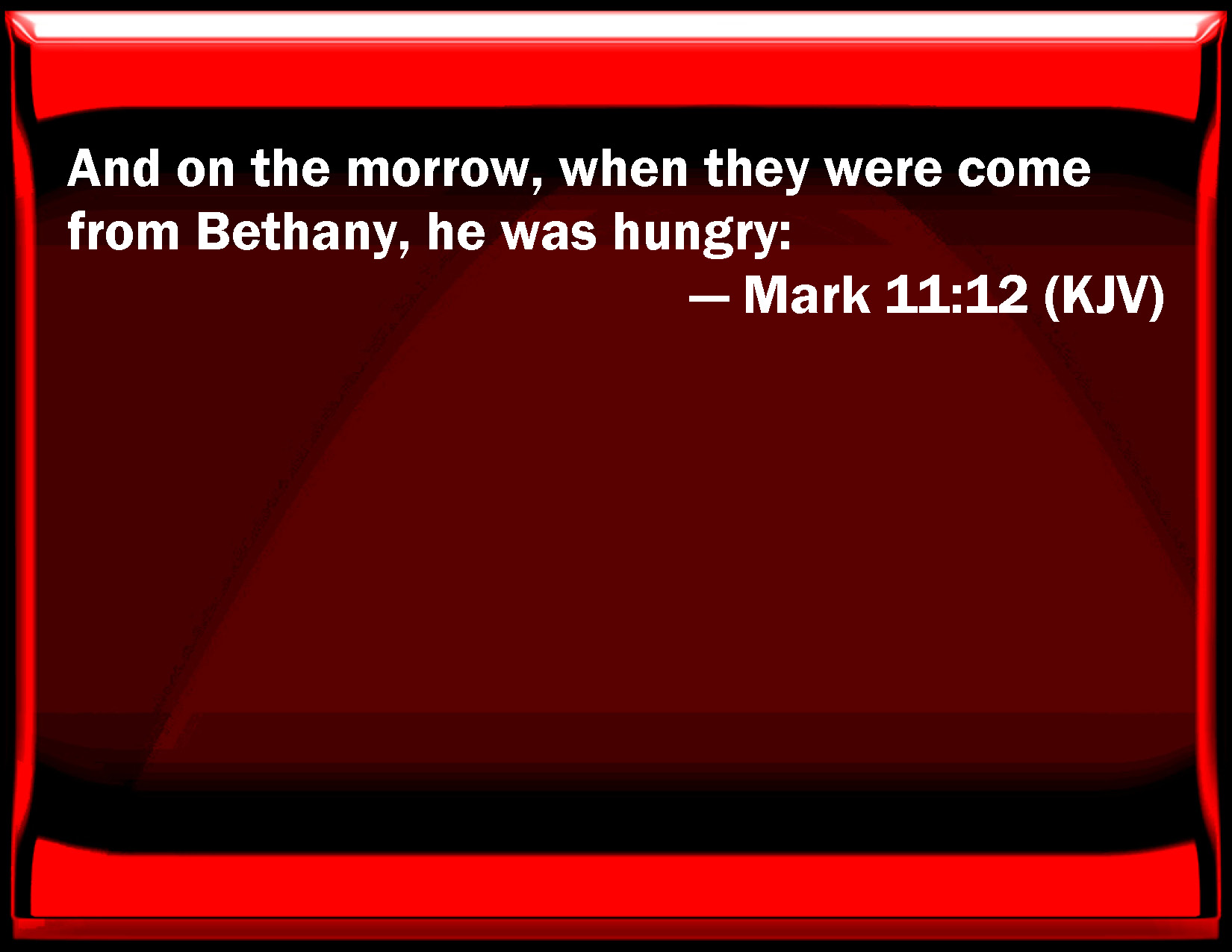 Bible Verse Slide Mark 11:12 And on the morrow, when they were come from Bethany, he was hungry: KJV: And on the morrow, when they were come from Bethany, he was hungry: DRB: And the next day when they came out from Bethania, he was hungry. DBT: And on the morrow, when they were gone out of Bethany, he hungered. ERV: And on the morrow, when they were come out from Bethany, he hungered. WBT: And on the morrow, when they had come from Bethany, he was hungry, WEB: The next day, when they had come out from Bethany, he was hungry. YLT: And on the morrow, they having come forth from Bethany, he hungered,Links Mark 11:12 NIV • Mark 11:12 NLT • Mark 11:12 ESV • Mark 11:12 NASB • Mark 11:12 KJV • Mark 11:12 Interlinear • Mark 11:12 Commentaries • Mark 11:12 Parallel Texts • Mark 11:12 Bible Apps • Mark 11:12 Parallel • Bible Hub |
