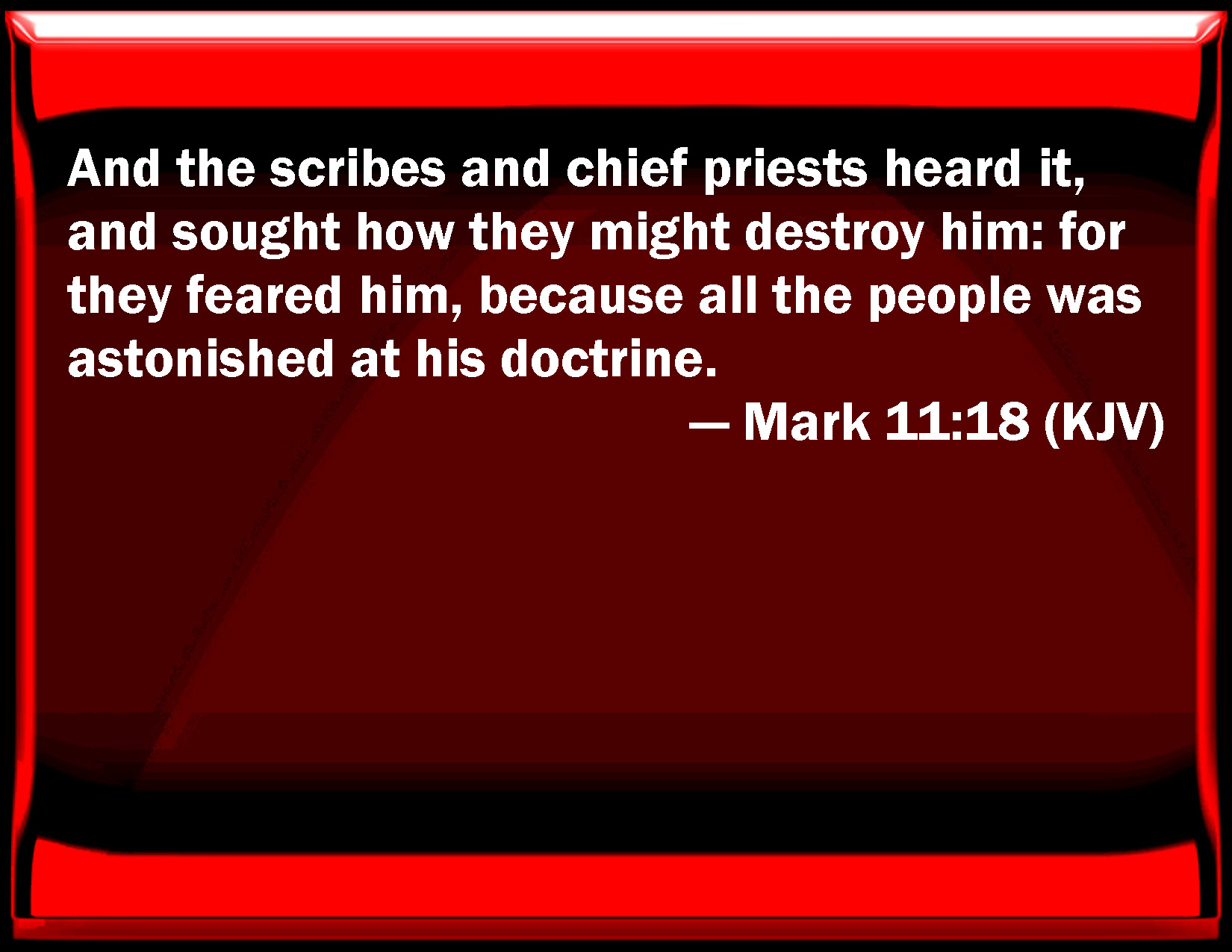 Bible Verse Slide Mark 11:18 And the scribes and chief priests heard it, and sought how they might destroy him: for they feared him, because all the people was astonished at his doctrine. KJV: And the scribes and chief priests heard it, and sought how they might destroy him: for they feared him, because all the people was astonished at his doctrine. DRB: Which when the chief priests and the scribes had heard, they sought how they might destroy him. For they feared him, because the whole multitude was in admiration at his doctrine. DBT: And the chief priests and the scribes heard it, and they sought how they might destroy him; for they feared him, because all the crowd were astonished at his doctrine. ERV: And the chief priests and the scribes heard it, and sought how they might destroy him: for they feared him, for all the multitude was astonished at his teaching. WBT: And the scribes and chief priests heard it, and sought how they might destroy him: for they feared him, because all the people were astonished at his doctrine. WEB: The chief priests and the scribes heard it, and sought how they might destroy him. For they feared him, because all the multitude was astonished at his teaching. YLT: And the scribes and the chief priests heard, and they were seeking how they shall destroy him, for they were afraid of him, because all the multitude was astonished at his teaching;Links Mark 11:18 NIV • Mark 11:18 NLT • Mark 11:18 ESV • Mark 11:18 NASB • Mark 11:18 KJV • Mark 11:18 Interlinear • Mark 11:18 Commentaries • Mark 11:18 Parallel Texts • Mark 11:18 Bible Apps • Mark 11:18 Parallel • Bible Hub |