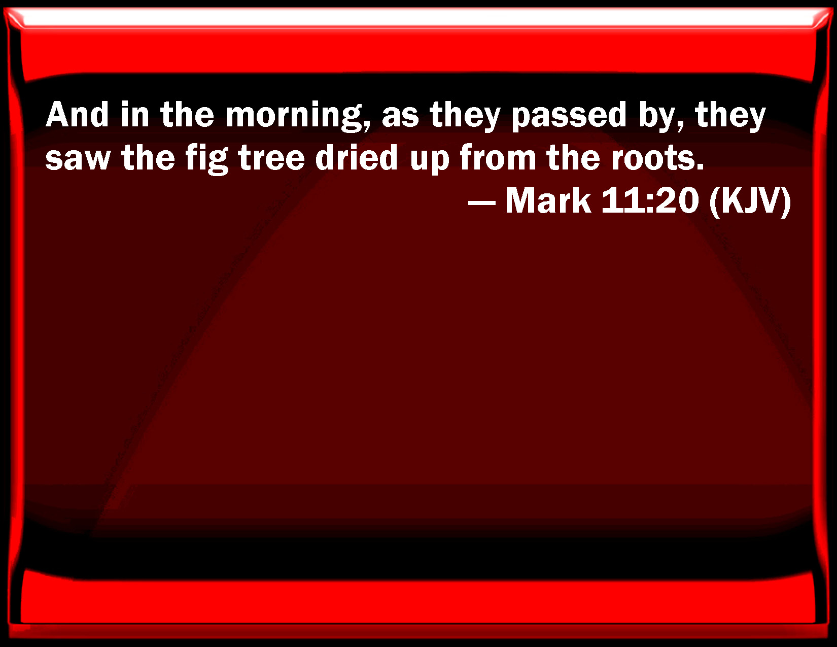 Bible Verse Slide Mark 11:20 And in the morning, as they passed by, they saw the fig tree dried up from the roots. KJV: And in the morning, as they passed by, they saw the fig tree dried up from the roots. DRB: And when they passed by in the morning they saw the fig tree dried up from the roots. DBT: And passing by early in the morning they saw the fig-tree dried up from the roots. ERV: And as they passed by in the morning, they saw the fig tree withered away from the roots. WBT: And in the morning, as they passed by, they saw the fig-tree dried up from the roots. WEB: As they passed by in the morning, they saw the fig tree withered away from the roots. YLT: And in the morning, passing by, they saw the fig-tree having been dried up from the roots,Links Mark 11:20 NIV • Mark 11:20 NLT • Mark 11:20 ESV • Mark 11:20 NASB • Mark 11:20 KJV • Mark 11:20 Interlinear • Mark 11:20 Commentaries • Mark 11:20 Parallel Texts • Mark 11:20 Bible Apps • Mark 11:20 Parallel • Bible Hub |