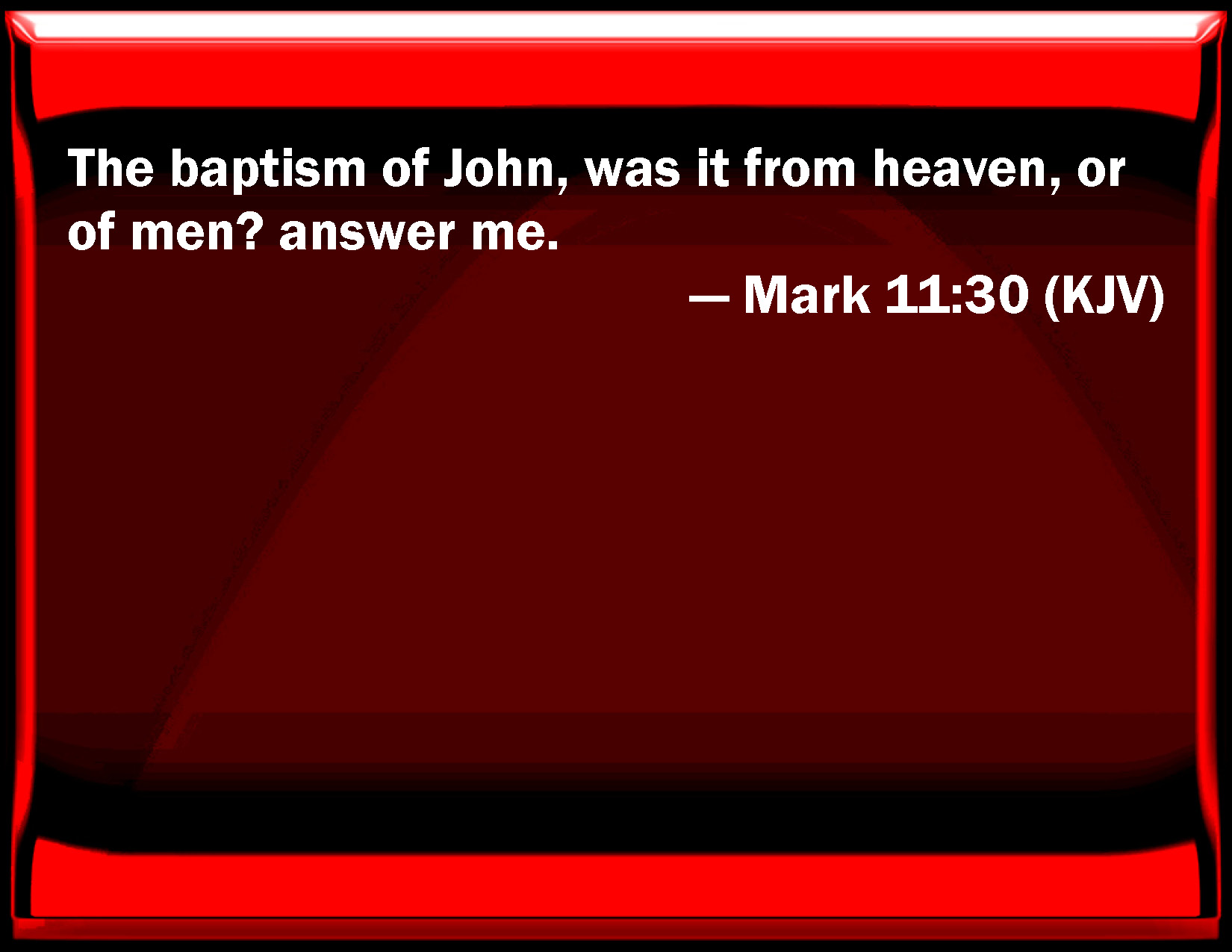 Bible Verse Slide Mark 11:30 The baptism of John, was it from heaven, or of men? answer me. KJV: The baptism of John, was it from heaven, or of men? answer me. DRB: The baptism of John, was it from heaven, or from men? Answer me. DBT: The baptism of John, was it of heaven, or of men? answer me. ERV: The baptism of John, was it from heaven, or from men? answer me. WBT: The baptism of John, was it from heaven, or from men? answer me. WEB: The baptism of John—was it from heaven, or from men? Answer me." YLT: the baptism of John — from heaven was it? or from men? answer me.'Links Mark 11:30 NIV • Mark 11:30 NLT • Mark 11:30 ESV • Mark 11:30 NASB • Mark 11:30 KJV • Mark 11:30 Interlinear • Mark 11:30 Commentaries • Mark 11:30 Parallel Texts • Mark 11:30 Bible Apps • Mark 11:30 Parallel • Bible Hub |