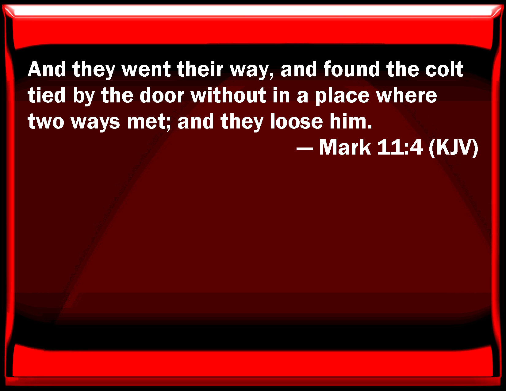 Bible Verse Slide Mark 11:4 And they went their way, and found the colt tied by the door without in a place where two ways met; and they loose him. KJV: And they went their way, and found the colt tied by the door without in a place where two ways met; and they loose him. DRB: And going their way, they found the colt tied before the gate without, in the meeting of two ways: and they loose him. DBT: And they departed, and found a colt bound to the door without at the crossway, and they loose him. ERV: And they went away, and found a colt tied at the door without in the open street; and they loose him. WBT: And they went, and found the colt tied by the door without, in a place where two ways met; and they loose him. WEB: They went away, and found a young donkey tied at the door outside in the open street, and they untied him. YLT: And they went away, and found the colt tied at the door without, by the two ways, and they loose it,Links Mark 11:4 NIV • Mark 11:4 NLT • Mark 11:4 ESV • Mark 11:4 NASB • Mark 11:4 KJV • Mark 11:4 Interlinear • Mark 11:4 Commentaries • Mark 11:4 Parallel Texts • Mark 11:4 Bible Apps • Mark 11:4 Parallel • Bible Hub |