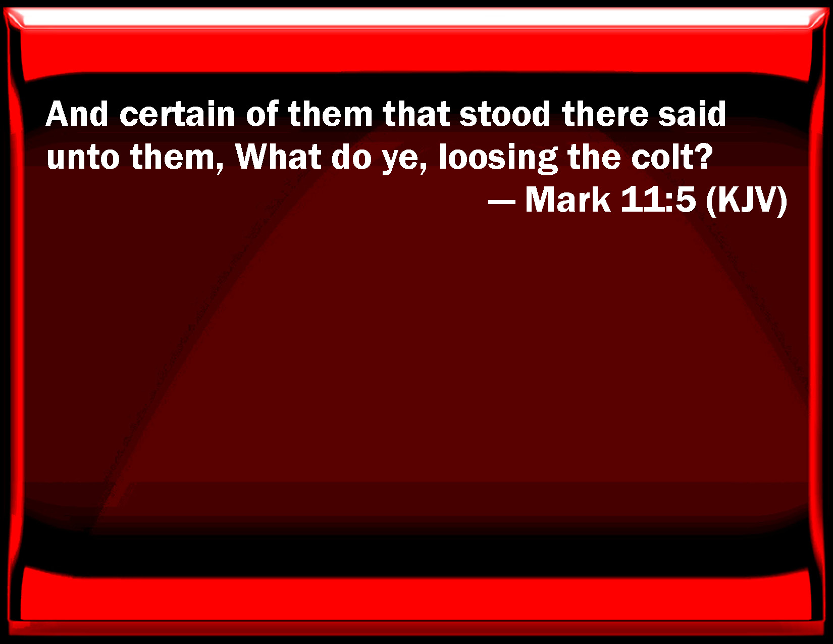 Bible Verse Slide Mark 11:5 And certain of them that stood there said to them, What do you, loosing the colt? KJV: And certain of them that stood there said unto them, What do ye, loosing the colt? DRB: And some of them that stood there, said to them: What do you loosing the colt? DBT: And some of those who stood there said to them, What are ye doing, loosing the colt? ERV: And certain of them that stood there said unto them, What do ye, loosing the colt? WBT: And certain of them that stood there, said to them, What do ye, loosing the colt? WEB: Some of those who stood there asked them, "What are you doing, untying the young donkey?" YLT: and certain of those standing there said to them, 'What do ye — loosing the colt?'Links Mark 11:5 NIV • Mark 11:5 NLT • Mark 11:5 ESV • Mark 11:5 NASB • Mark 11:5 KJV • Mark 11:5 Interlinear • Mark 11:5 Commentaries • Mark 11:5 Parallel Texts • Mark 11:5 Bible Apps • Mark 11:5 Parallel • Bible Hub |