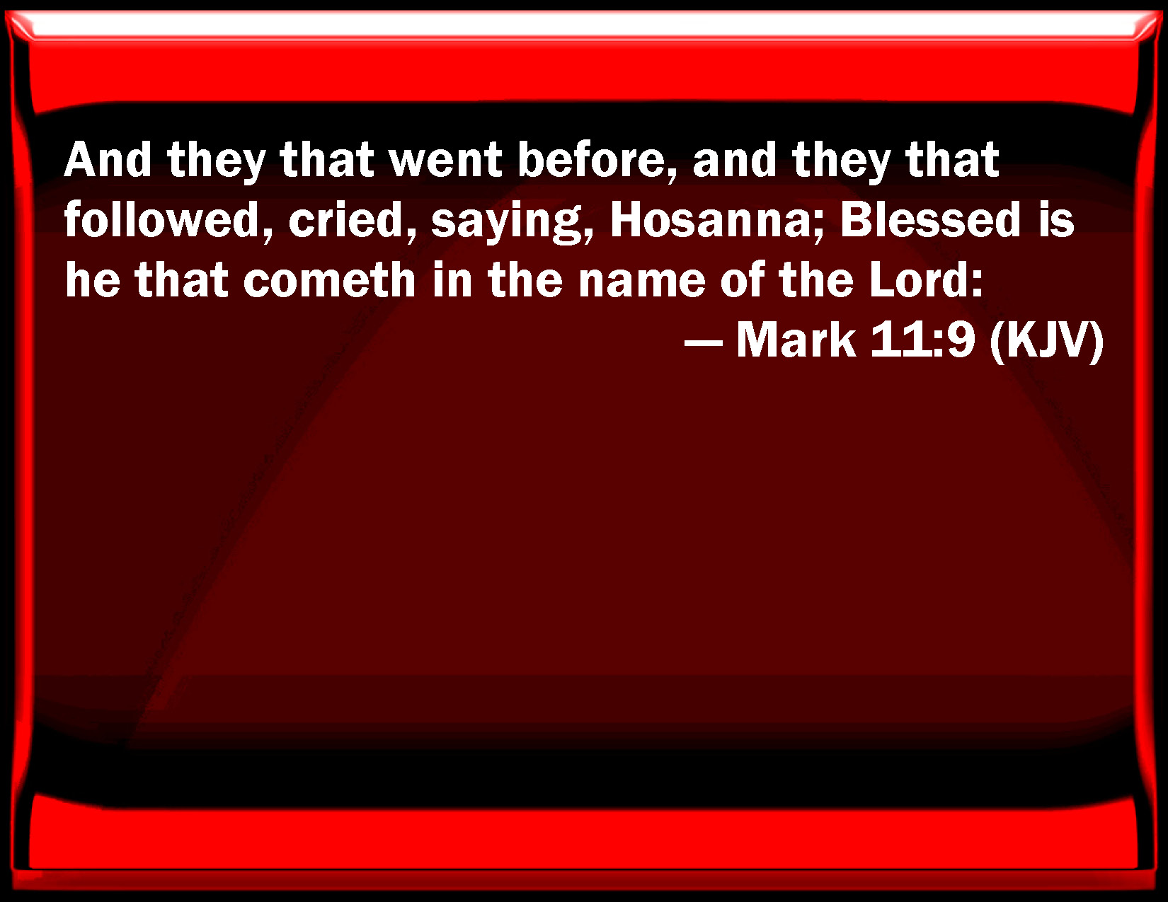 Bible Verse Slide Mark 11:9 And they that went before, and they that followed, cried, saying, Hosanna; Blessed is he that comes in the name of the Lord: KJV: And they that went before, and they that followed, cried, saying, Hosanna; Blessed is he that cometh in the name of the Lord: DRB: And they that went before and they that followed, cried, saying: Hosanna, blessed is he that cometh in the name of the Lord. DBT: And those going on before and those following cried out, Hosanna! blessed be he that comes in the Lord's name. ERV: And they that went before, and they that followed, cried, Hosanna; Blessed is he that cometh in the name of the Lord: WBT: And they that went before, and they that followed, cried, saying, Hosanna: Blessed is he that cometh in the name of the Lord. WEB: Those who went in front, and those who followed, cried out, "Hosanna! Blessed is he who comes in the name of the Lord! YLT: And those going before and those following were crying out, saying, 'Hosanna! blessed is he who is coming in the name of the Lord;Links Mark 11:9 NIV • Mark 11:9 NLT • Mark 11:9 ESV • Mark 11:9 NASB • Mark 11:9 KJV • Mark 11:9 Interlinear • Mark 11:9 Commentaries • Mark 11:9 Parallel Texts • Mark 11:9 Bible Apps • Mark 11:9 Parallel • Bible Hub |