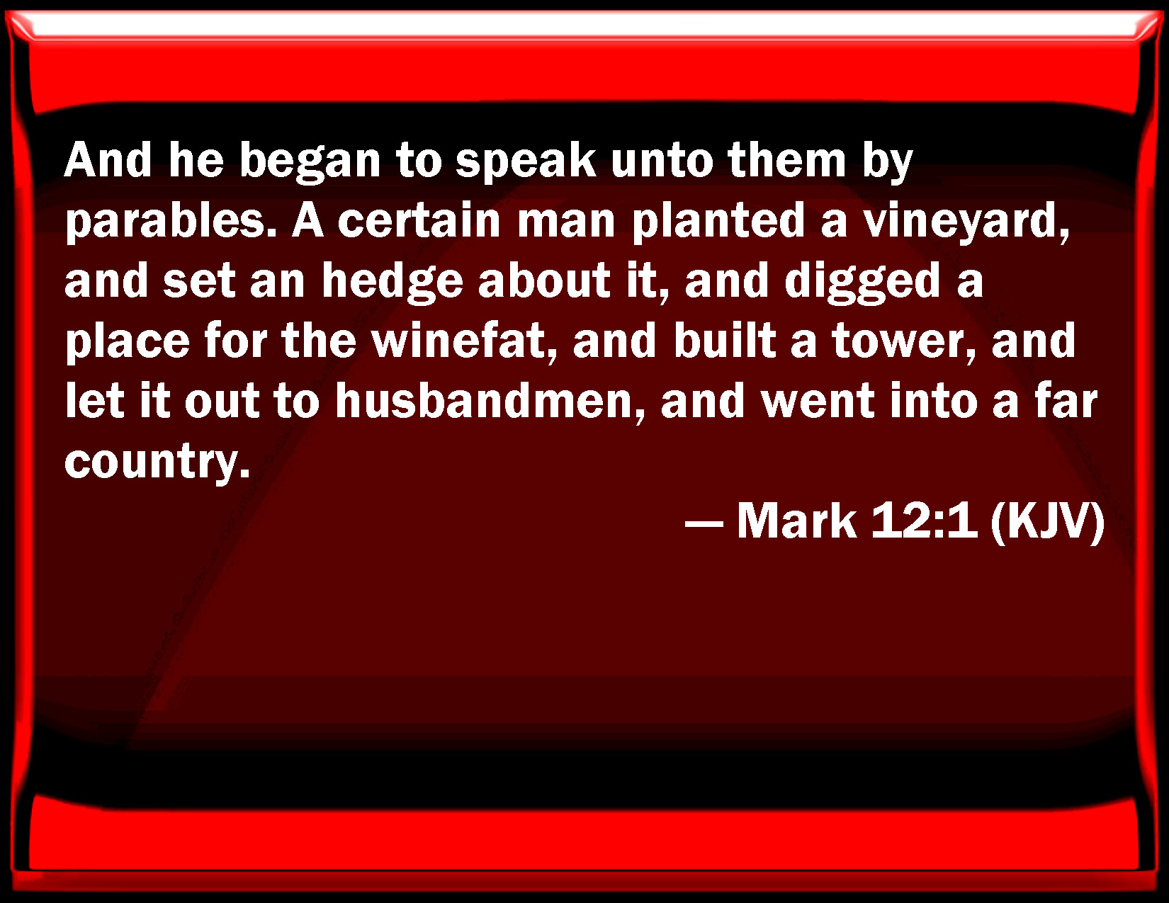 Bible Verse Slide Mark 12:1 And he began to speak to them by parables. A certain man planted a vineyard, and set an hedge about it, and dig a place for the winefat, and built a tower, and let it out to farmers, and went into a far country. KJV: And he began to speak unto them by parables. A certain man planted a vineyard, and set an hedge about it, and digged a place for the winefat, and built a tower, and let it out to husbandmen, and went into a far country. DRB: AND he began to speak to them in parables: A certain man planted a vineyard and made a hedge about it, and dug a place for the winefat, and built a tower, and let it to husbandmen; and went into a far country. DBT: And he began to say to them in parables, A man planted a vineyard, and made a fence round it and dug a wine-vat, and built a tower, and let it out to husbandmen, and left the country. ERV: And he began to speak unto them in parables. A man planted a vineyard, and set a hedge about it, and digged a pit for the winepress, and built a tower, and let it out to husbandmen, and went into another country. WBT: And he began to speak to them by parables. A certain man planted a vineyard, and set a hedge about it, and digged a place for the wine-vat, and built a tower, and let it out to husbandmen, and went into a far country. WEB: He began to speak to them in parables. "A man planted a vineyard, put a hedge around it, dug a pit for the winepress, built a tower, rented it out to a farmer, and went into another country. YLT: And he began to speak to them in similes: 'A man planted a vineyard, and put a hedge around, and digged an under-wine-vat, and built a tower, and gave it out to husbandmen, and went abroad;Links Mark 12:1 NIV • Mark 12:1 NLT • Mark 12:1 ESV • Mark 12:1 NASB • Mark 12:1 KJV • Mark 12:1 Interlinear • Mark 12:1 Commentaries • Mark 12:1 Parallel Texts • Mark 12:1 Bible Apps • Mark 12:1 Parallel • Bible Hub |