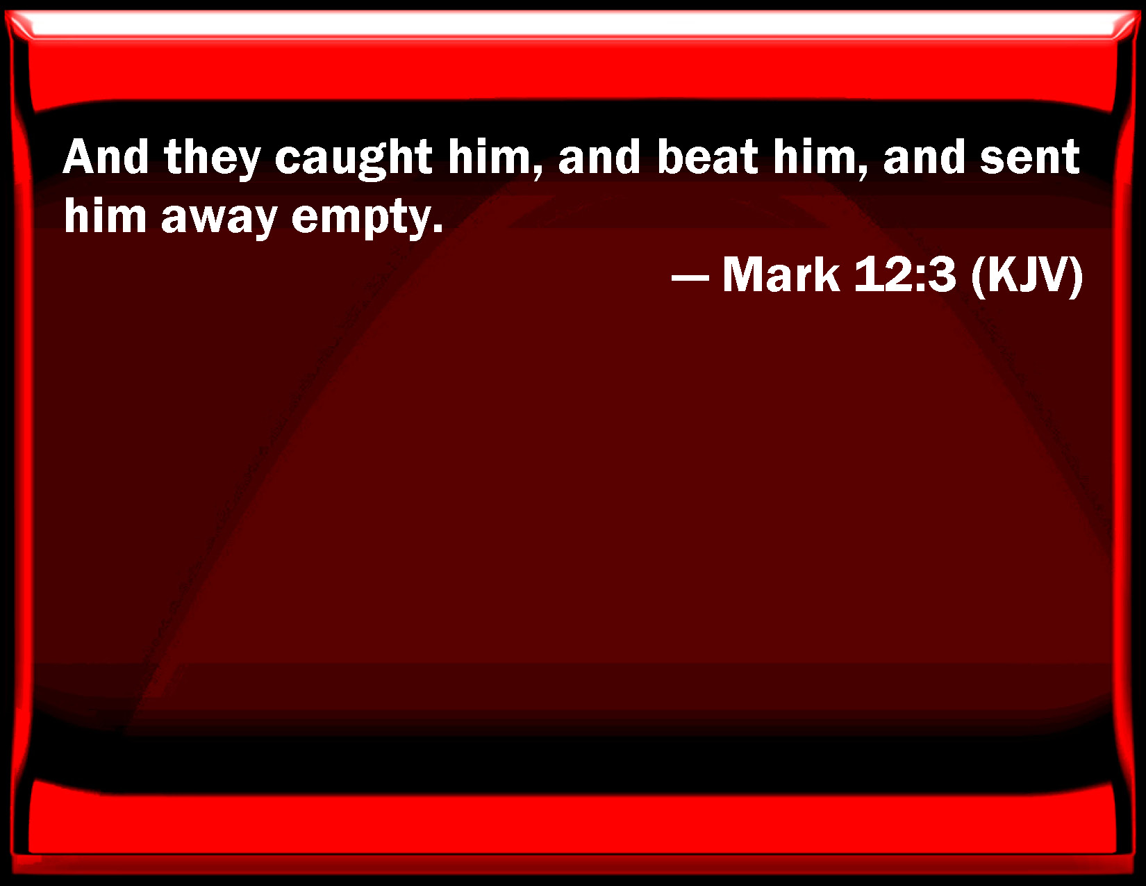 Bible Verse Slide Mark 12:3 And they caught him, and beat him, and sent him away empty. KJV: And they caught him, and beat him, and sent him away empty. DRB: Who having laid hands on him, beat him, and sent him away empty. DBT: But they took him, and beat him, and sent him away empty. ERV: And they took him, and beat him, and sent him away empty. WBT: And they caught him, and beat him and sent him away empty. WEB: They took him, beat him, and sent him away empty. YLT: and they, having taken him, did severely beat him, and did send him away empty.Links Mark 12:3 NIV • Mark 12:3 NLT • Mark 12:3 ESV • Mark 12:3 NASB • Mark 12:3 KJV • Mark 12:3 Interlinear • Mark 12:3 Commentaries • Mark 12:3 Parallel Texts • Mark 12:3 Bible Apps • Mark 12:3 Parallel • Bible Hub |