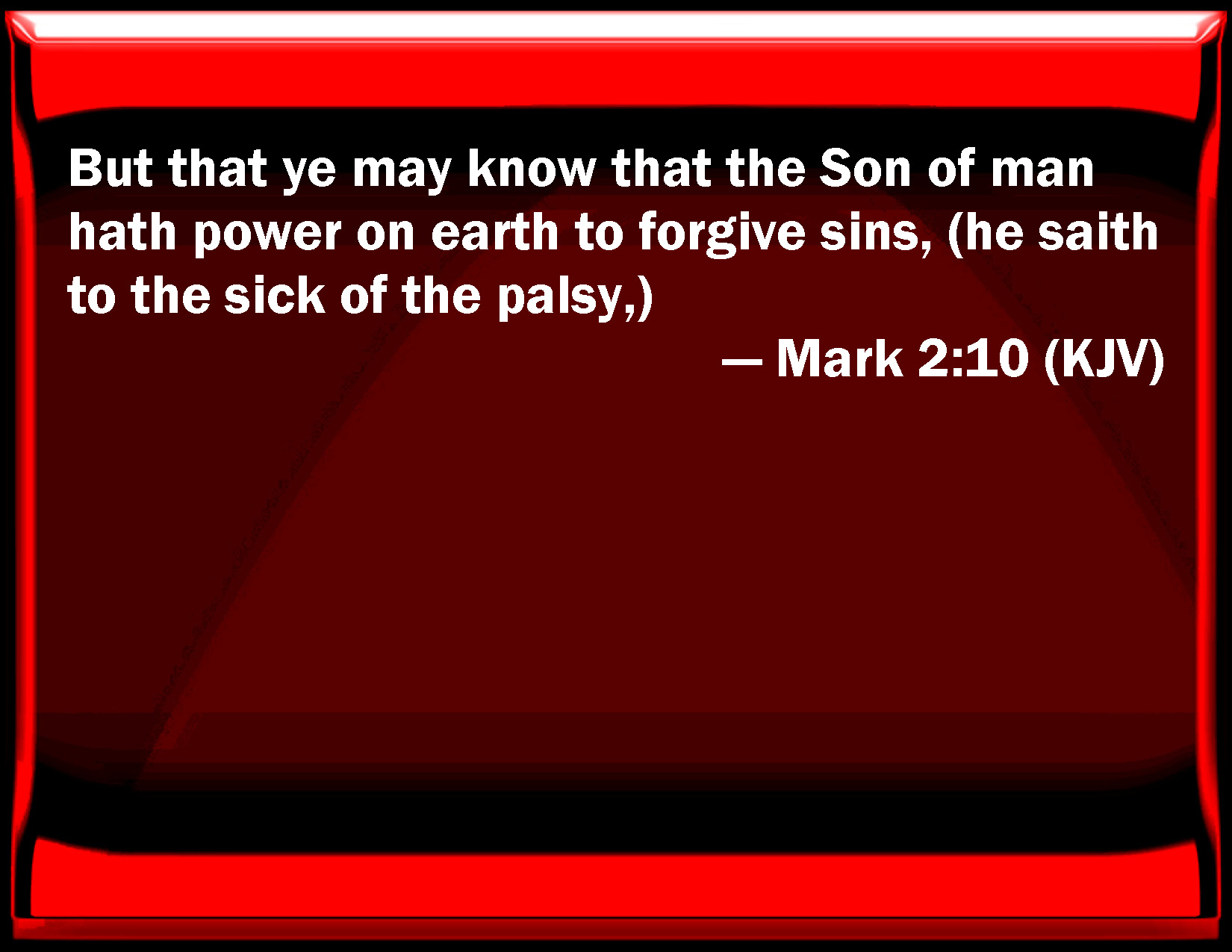 Bible Verse Slide Mark 2:10 But that you may know that the Son of man has power on earth to forgive sins, (he said to the sick of the palsy,) KJV: But that ye may know that the Son of man hath power on earth to forgive sins, (he saith to the sick of the palsy,) DRB: But that you may know that the Son of man hath power on earth to forgive sins, (he saith to the sick of the palsy,) DBT: But that ye may know that the Son of man has power on earth to forgive sins, he says to the paralytic, ERV: But that ye may know that the Son of man hath power on earth to forgive sins (he saith to the sick of the palsy), WBT: But that ye may know that the Son of man hath power on earth to forgive sins, he saith to the sick with the palsy, WEB: But that you may know that the Son of Man has authority on earth to forgive sins"—he said to the paralytic— YLT: And, that ye may know that the Son of Man hath authority on the earth to forgive sins — (he saith to the paralytic) — Links Mark 2:10 NIV • Mark 2:10 NLT • Mark 2:10 ESV • Mark 2:10 NASB • Mark 2:10 KJV • Mark 2:10 Interlinear • Mark 2:10 Commentaries • Mark 2:10 Parallel Texts • Mark 2:10 Bible Apps • Mark 2:10 Parallel • Bible Hub |