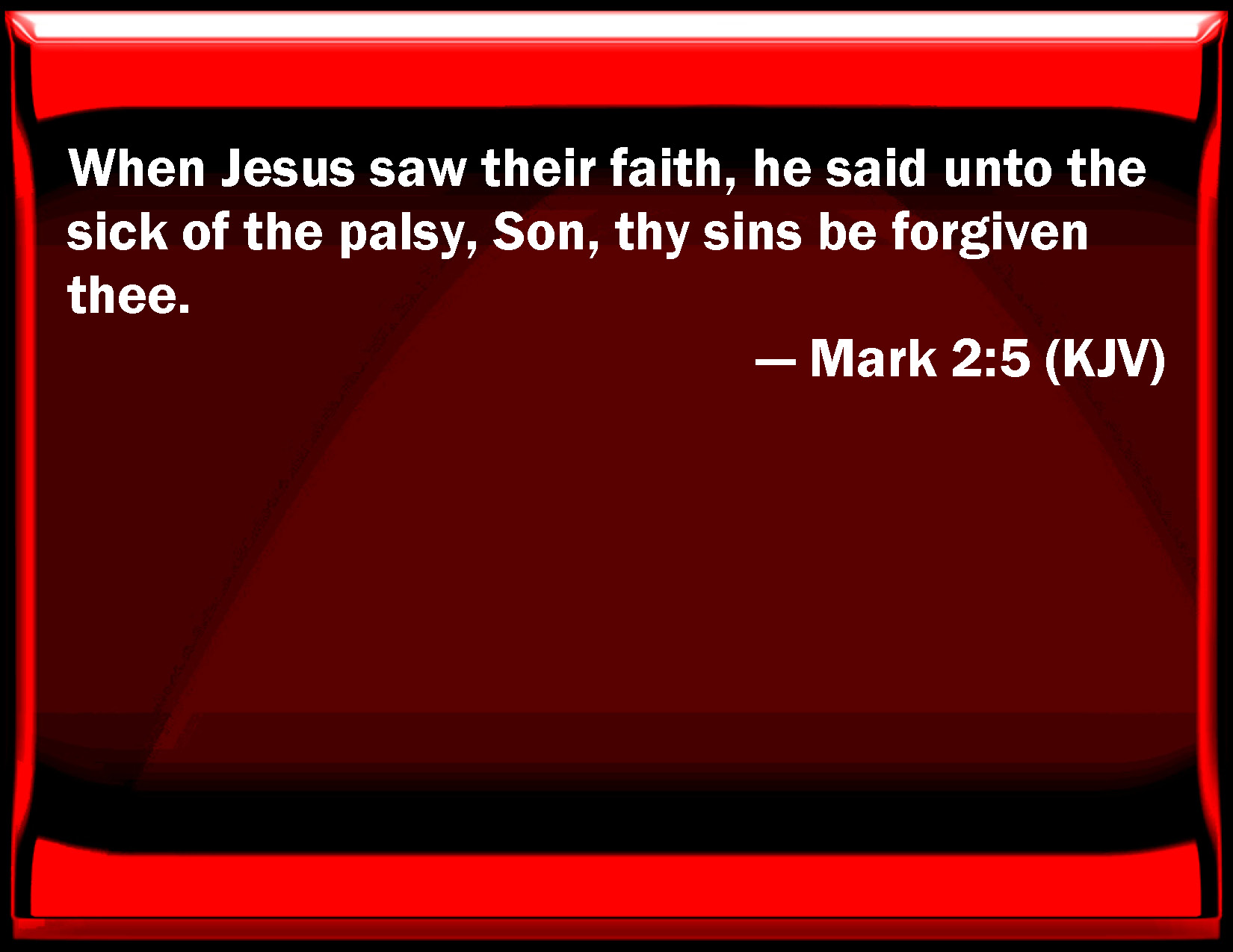Bible Verse Slide Mark 2:5 When Jesus saw their faith, he said to the sick of the palsy, Son, your sins be forgiven you. KJV: When Jesus saw their faith, he said unto the sick of the palsy, Son, thy sins be forgiven thee. DRB: And when Jesus had seen their faith, he saith to the sick of the palsy: Son, thy sins are forgiven thee. DBT: But Jesus, seeing their faith, says to the paralytic, Child, thy sins are forgiven thee. ERV: And Jesus seeing their faith saith unto the sick of the palsy, Son, thy sins are forgiven. WBT: When Jesus saw their faith, he said to the sick with the palsy, Son, thy sins are forgiven thee. WEB: Jesus, seeing their faith, said to the paralytic, "Son, your sins are forgiven you." YLT: and Jesus having seen their faith, saith to the paralytic, 'Child, thy sins have been forgiven thee.'Links Mark 2:5 NIV • Mark 2:5 NLT • Mark 2:5 ESV • Mark 2:5 NASB • Mark 2:5 KJV • Mark 2:5 Interlinear • Mark 2:5 Commentaries • Mark 2:5 Parallel Texts • Mark 2:5 Bible Apps • Mark 2:5 Parallel • Bible Hub |