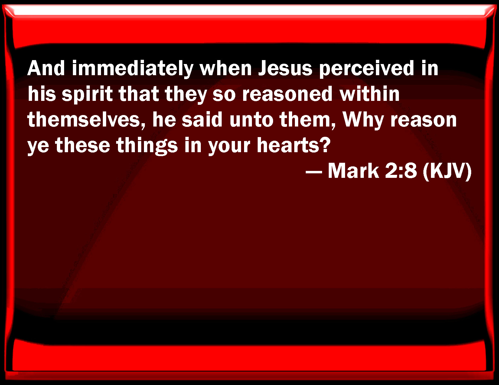 Bible Verse Slide Mark 2:8 And immediately when Jesus perceived in his spirit that they so reasoned within themselves, he said to them, Why reason you these things in your hearts? KJV: And immediately when Jesus perceived in his spirit that they so reasoned within themselves, he said unto them, Why reason ye these things in your hearts? DRB: Which Jesus presently knowing in his spirit, that they so thought within themselves, saith to them: Why think you these things in your hearts? DBT: And straightway Jesus, knowing in his spirit that they are reasoning thus within themselves, said to them, Why reason ye these things in your hearts? ERV: And straightway Jesus, perceiving in his spirit that they so reasoned within themselves, saith unto them, Why reason ye these things in your hearts? WBT: And immediately, when Jesus perceived in his spirit that they so reasoned within themselves, he said to them, Why reason ye these things in your hearts? WEB: Immediately Jesus, perceiving in his spirit that they so reasoned within themselves, said to them, "Why do you reason these things in your hearts? YLT: And immediately Jesus, having known in his spirit that they thus reason in themselves, said to them, 'Why these things reason ye in your hearts?Links Mark 2:8 NIV • Mark 2:8 NLT • Mark 2:8 ESV • Mark 2:8 NASB • Mark 2:8 KJV • Mark 2:8 Interlinear • Mark 2:8 Commentaries • Mark 2:8 Parallel Texts • Mark 2:8 Bible Apps • Mark 2:8 Parallel • Bible Hub |