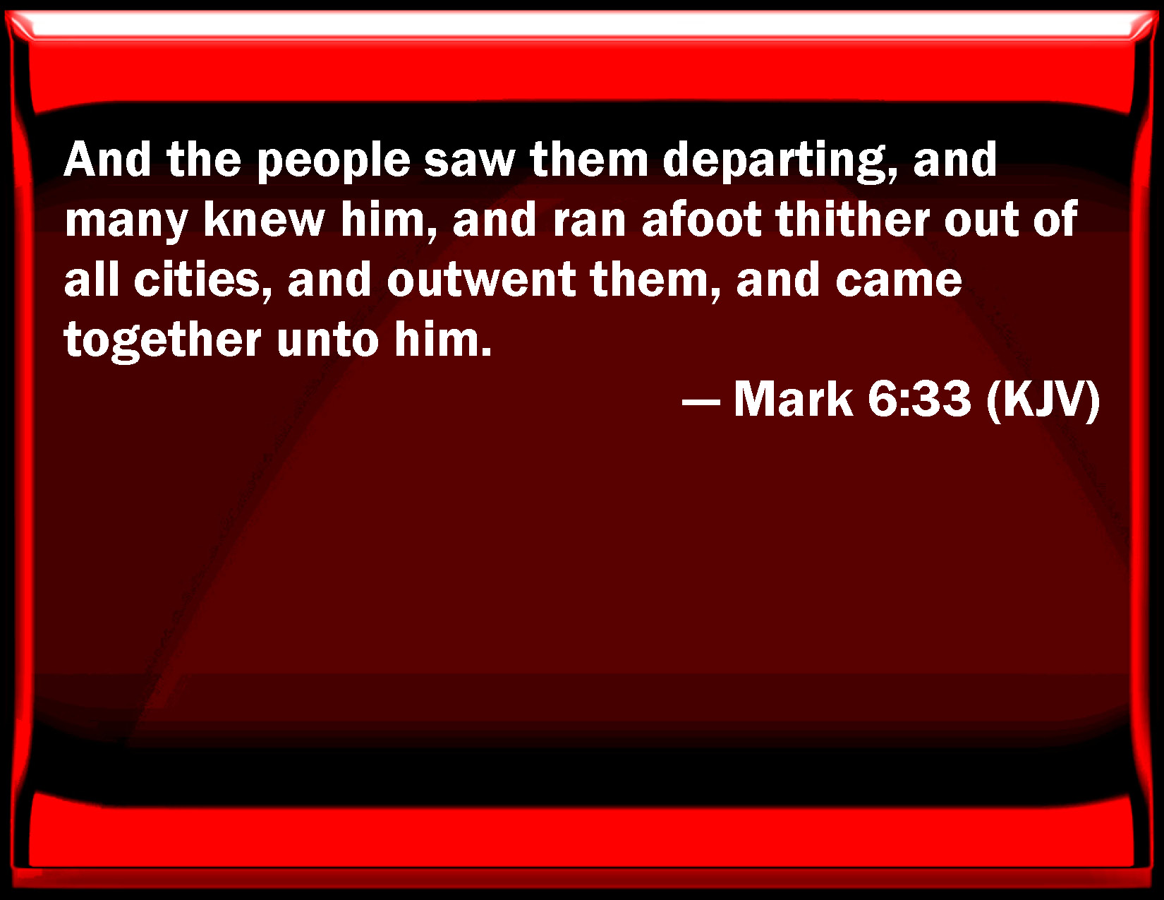 Bible Verse Slide Mark 6:33 And the people saw them departing, and many knew him, and ran afoot thither out of all cities, and preceded them, and came together to him. KJV: And the people saw them departing, and many knew him, and ran afoot thither out of all cities, and outwent them, and came together unto him. DRB: And they saw them going away, and many knew: and they ran flocking thither on foot from all the cities, and were there before them. DBT: And many saw them going, and recognised them, and ran together there on foot, out of all the cities, and got there before them. ERV: And the people saw them going, and many knew them, and they ran there together on foot from all the cities, and outwent them. WBT: And the people saw them departing, and many knew him, and ran on foot thither out of all cities, and out went them, and came together to him. WEB: They saw them going, and many recognized him and ran there on foot from all the cities. They arrived before them and came together to him. YLT: And the multitudes saw them going away, and many recognised him, and by land from all the cities they ran thither, and went before them, and came together to him,Links Mark 6:33 NIV • Mark 6:33 NLT • Mark 6:33 ESV • Mark 6:33 NASB • Mark 6:33 KJV • Mark 6:33 Interlinear • Mark 6:33 Commentaries • Mark 6:33 Parallel Texts • Mark 6:33 Bible Apps • Mark 6:33 Parallel • Bible Hub |