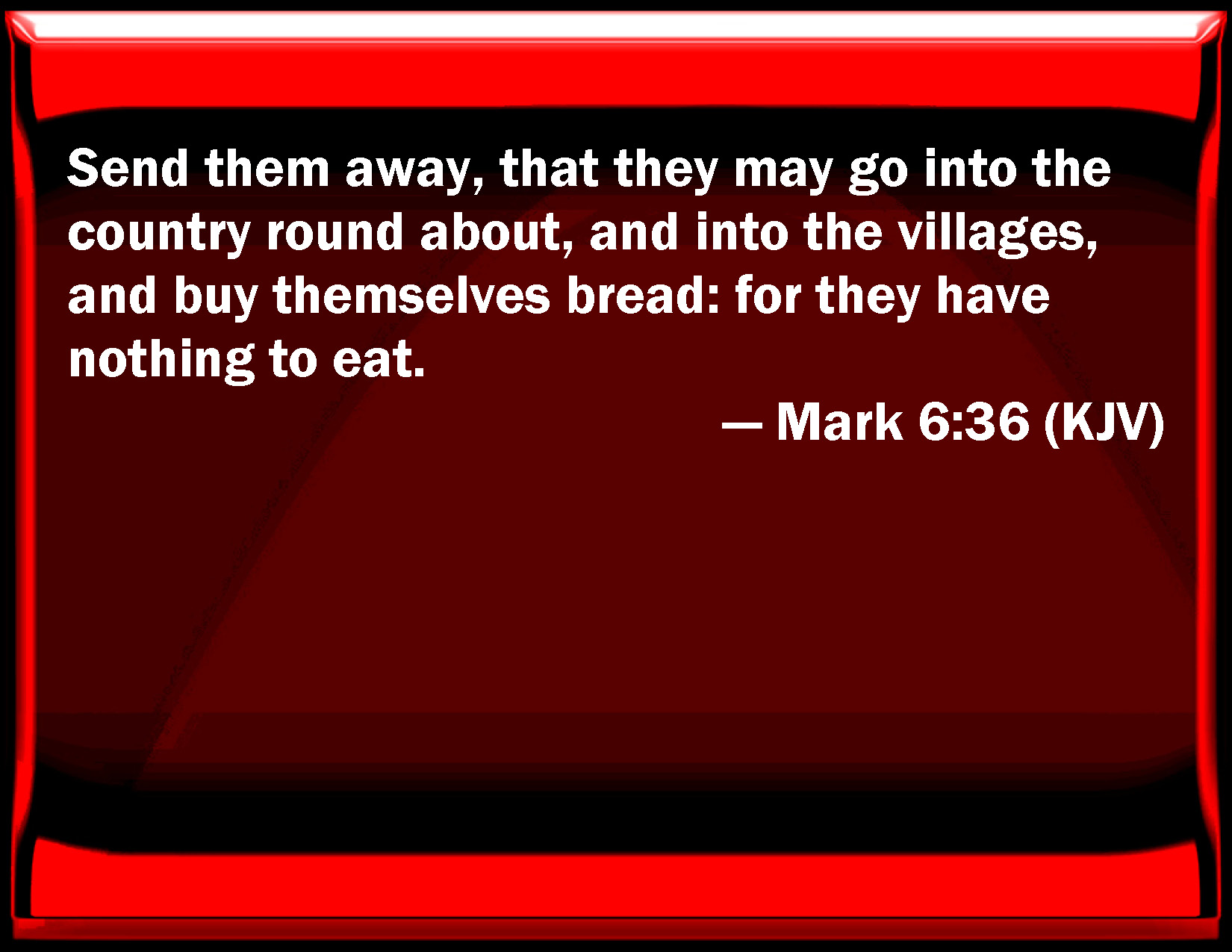Bible Verse Slide Mark 6:36 Send them away, that they may go into the country round about, and into the villages, and buy themselves bread: for they have nothing to eat. KJV: Send them away, that they may go into the country round about, and into the villages, and buy themselves bread: for they have nothing to eat. DRB: Send them away, that going into the next villages and towns, they may buy themselves meat to eat. DBT: send them away that they may go into the country and villages around, and buy themselves bread, for they have not anything they can eat. ERV: send them away, that they may go into the country and villages round about, and buy themselves somewhat to eat. WBT: Send them away, that they may go into the country around, and into the villages, and buy themselves bread: for they have nothing to eat. WEB: Send them away, that they may go into the surrounding country and villages, and buy themselves bread, for they have nothing to eat." YLT: let them away, that, having gone away to the surrounding fields and villages, they may buy to themselves loaves, for what they may eat they have not.'Links Mark 6:36 NIV • Mark 6:36 NLT • Mark 6:36 ESV • Mark 6:36 NASB • Mark 6:36 KJV • Mark 6:36 Interlinear • Mark 6:36 Commentaries • Mark 6:36 Parallel Texts • Mark 6:36 Bible Apps • Mark 6:36 Parallel • Bible Hub |