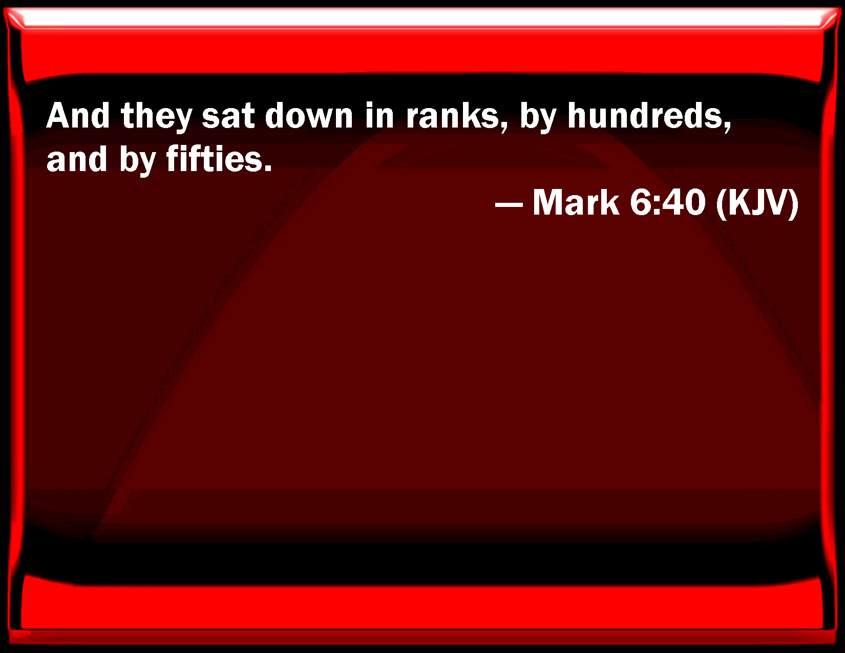 Bible Verse Slide Mark 6:40 And they sat down in ranks, by hundreds, and by fifties. KJV: And they sat down in ranks, by hundreds, and by fifties. DRB: And they sat down in ranks, by hundreds and by fifties. DBT: And they sat down in ranks by hundreds and by fifties. ERV: And they sat down in ranks, by hundreds, and by fifties. WBT: And they sat down in ranks, by hundreds, and by fifties. WEB: They sat down in ranks, by hundreds and by fifties. YLT: and they sat down in squares, by hundreds, and by fifties.Links Mark 6:40 NIV • Mark 6:40 NLT • Mark 6:40 ESV • Mark 6:40 NASB • Mark 6:40 KJV • Mark 6:40 Interlinear • Mark 6:40 Commentaries • Mark 6:40 Parallel Texts • Mark 6:40 Bible Apps • Mark 6:40 Parallel • Bible Hub |