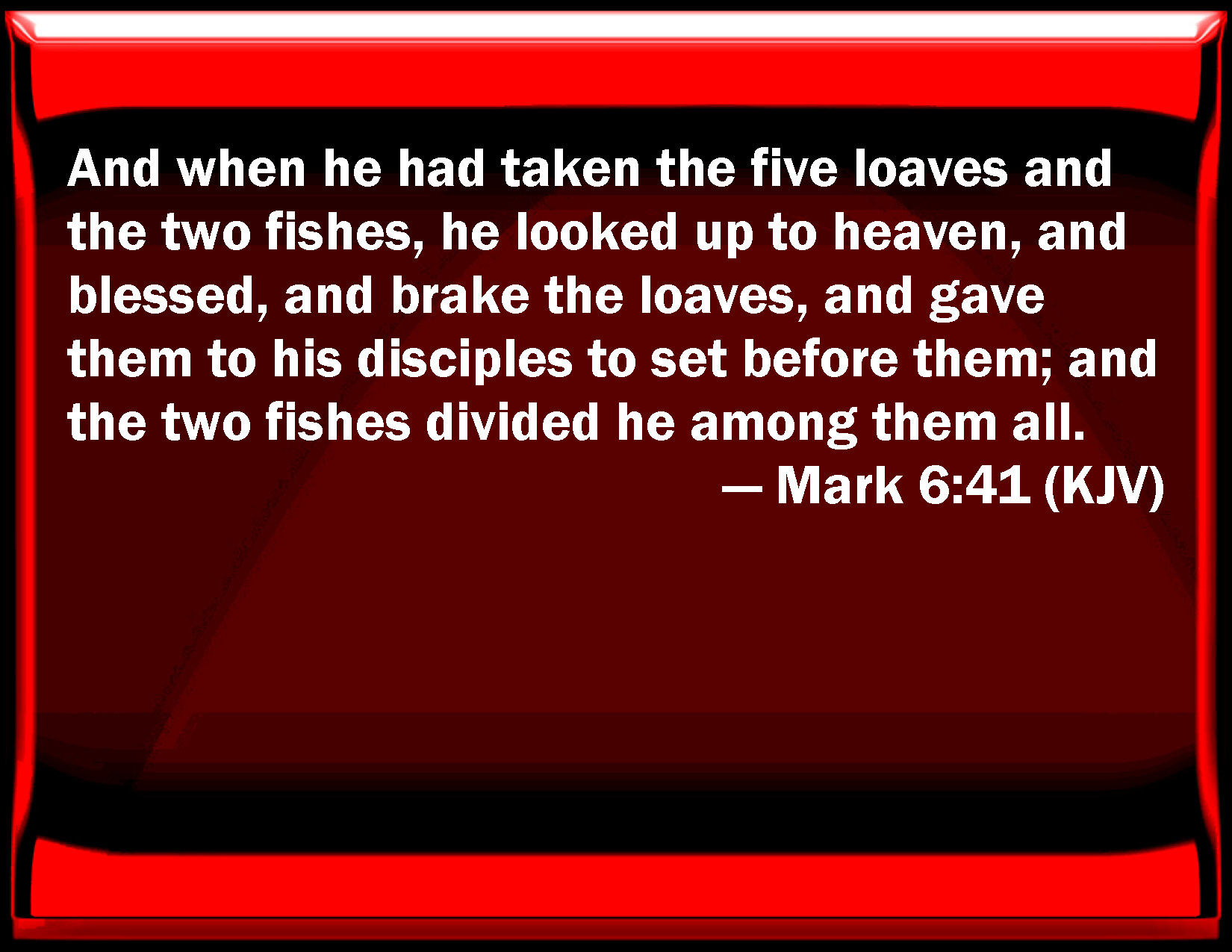 Bible Verse Slide Mark 6:41 And when he had taken the five loaves and the two fishes, he looked up to heaven, and blessed, and broke the loaves, and gave them to his disciples to set before them; and the two fishes divided he among them all. KJV: And when he had taken the five loaves and the two fishes, he looked up to heaven, and blessed, and brake the loaves, and gave them to his disciples to set before them; and the two fishes divided he among them all. DRB: And when he had taken the five loaves, and the two fishes: looking up to heaven, he blessed, and broke the loaves, and gave to his disciples to set before them: and the two fishes he divided among them all. DBT: And having taken the five loaves and the two fishes, looking up to heaven, he blessed, and broke the loaves, and gave them to his disciples that they might set them before them. And the two fishes he divided among all. ERV: And he took the five loaves and the two fishes, and looking up to heaven, he blessed, and brake the loaves; and he gave to the disciples to set before them; and the two fishes divided he among them all. WBT: And when he had taken the five loaves, and the two fishes, he looked up to heaven, and blessed, and broke the loaves, and gave them to his disciples to set before them; and the two fishes he divided among them all. WEB: He took the five loaves and the two fish, and looking up to heaven, he blessed and broke the loaves, and he gave to his disciples to set before them, and he divided the two fish among them all. YLT: And having taken the five loaves and the two fishes, having looked up to the heaven, he blessed, and brake the loaves, and was giving to his disciples, that they may set before them, and the two fishes divided he to all,Links Mark 6:41 NIV • Mark 6:41 NLT • Mark 6:41 ESV • Mark 6:41 NASB • Mark 6:41 KJV • Mark 6:41 Interlinear • Mark 6:41 Commentaries • Mark 6:41 Parallel Texts • Mark 6:41 Bible Apps • Mark 6:41 Parallel • Bible Hub |
