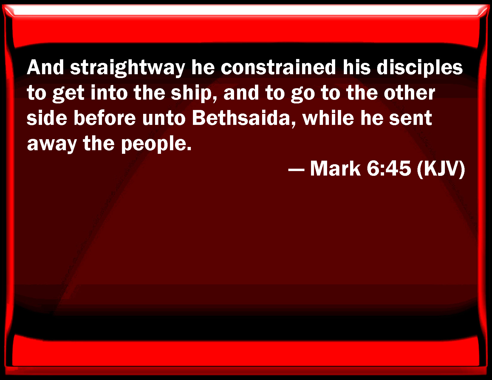 Bible Verse Slide Mark 6:45 And straightway he constrained his disciples to get into the ship, and to go to the other side before to Bethsaida, while he sent away the people. KJV: And straightway he constrained his disciples to get into the ship, and to go to the other side before unto Bethsaida, while he sent away the people. DRB: And immediately he obliged his disciples to go up into the ship, that they might go before him over the water to Bethsaida, whilst he dismissed the people. DBT: And immediately he compelled his disciples to go on board ship, and to go on before to the other side to Bethsaida, while he sends the crowd away. ERV: And straightway he constrained his disciples to enter into the boat, and to go before him unto the other side to Bethsaida, while he himself sendeth the multitude away. WBT: And immediately he constrained his disciples to get into the boat, and to go to the other side before to Bethsaida, while he sent away the people. WEB: Immediately he made his disciples get into the boat, and to go ahead to the other side, to Bethsaida, while he himself sent the multitude away. YLT: And immediately he constrained his disciples to go into the boat, and to go before to the other side, unto Bethsaida, till he may let the multitude away,Links Mark 6:45 NIV • Mark 6:45 NLT • Mark 6:45 ESV • Mark 6:45 NASB • Mark 6:45 KJV • Mark 6:45 Interlinear • Mark 6:45 Commentaries • Mark 6:45 Parallel Texts • Mark 6:45 Bible Apps • Mark 6:45 Parallel • Bible Hub |