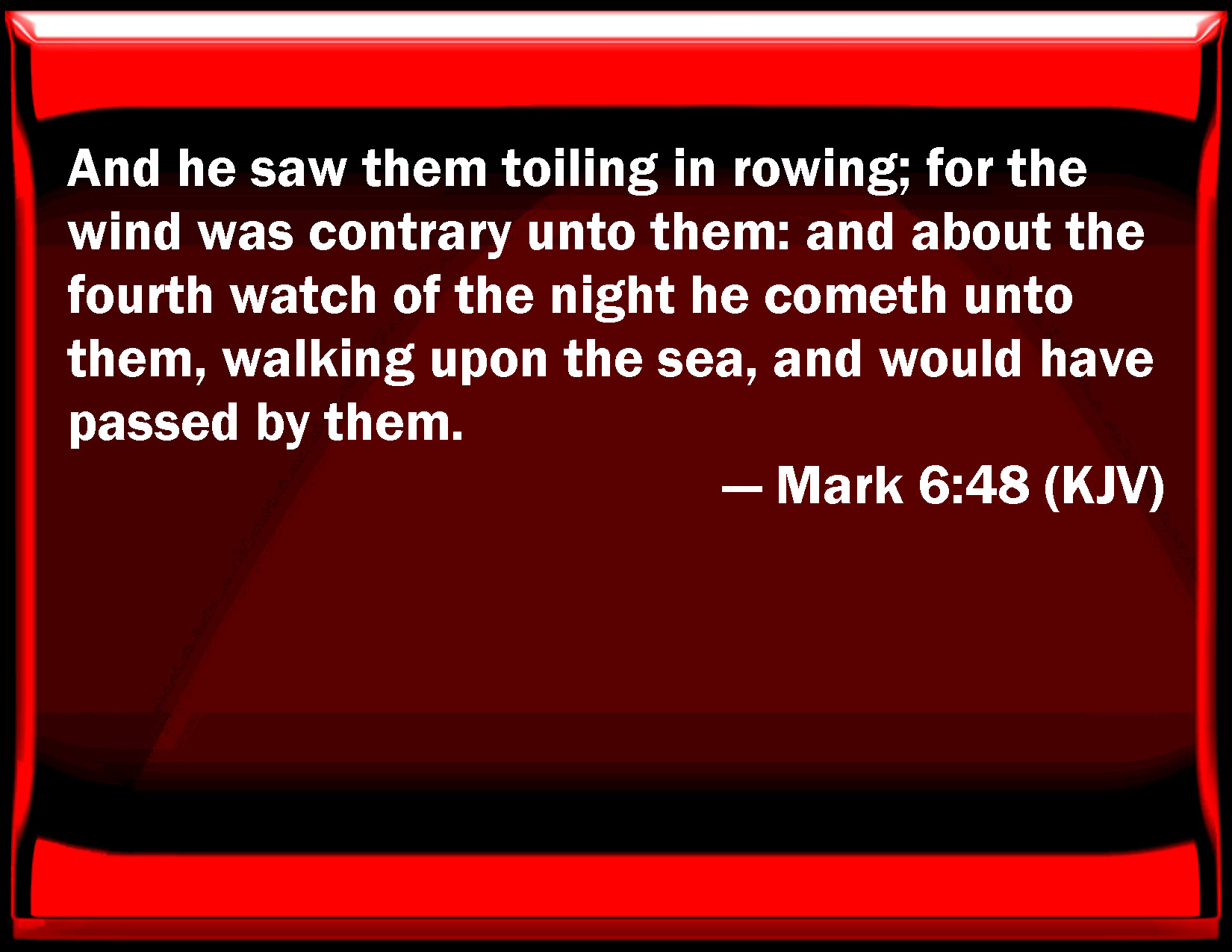 Bible Verse Slide Mark 6:48 And he saw them toiling in rowing; for the wind was contrary to them: and about the fourth watch of the night he comes to them, walking on the sea, and would have passed by them. KJV: And he saw them toiling in rowing; for the wind was contrary unto them: and about the fourth watch of the night he cometh unto them, walking upon the sea, and would have passed by them. DRB: And seeing them labouring in rowing, (for the wind was against them,) and about the fourth watch of the night, he cometh to them walking upon the sea, and he would have passed by them. DBT: And seeing them labouring in rowing, for the wind was contrary to them, about the fourth watch of the night he comes to them walking on the sea, and would have passed them by. ERV: And seeing them distressed in rowing, for the wind was contrary unto them, about the fourth watch of the night he cometh unto them, walking on the sea; and he would have passed by them: WBT: And he saw them toiling in rowing; for the wind was contrary to them: and about the fourth watch of the night he cometh to them, walking upon the sea, and would have passed by them. WEB: Seeing them distressed in rowing, for the wind was contrary to them, about the fourth watch of the night he came to them, walking on the sea, and he would have passed by them, YLT: and he saw them harassed in the rowing, for the wind was against them, and about the fourth watch of the night he doth come to them walking on the sea, and wished to pass by them.Links Mark 6:48 NIV • Mark 6:48 NLT • Mark 6:48 ESV • Mark 6:48 NASB • Mark 6:48 KJV • Mark 6:48 Interlinear • Mark 6:48 Commentaries • Mark 6:48 Parallel Texts • Mark 6:48 Bible Apps • Mark 6:48 Parallel • Bible Hub |