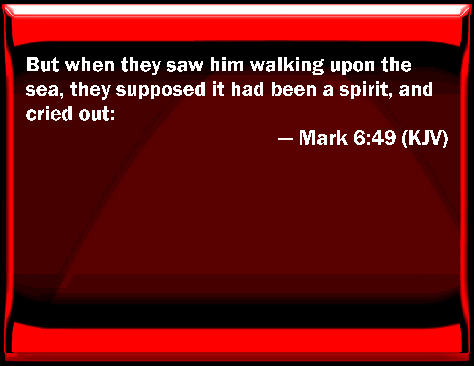 Bible Verse Slide Mark 6:49 But when they saw him walking on the sea, they supposed it had been a spirit, and cried out: KJV: But when they saw him walking upon the sea, they supposed it had been a spirit, and cried out: DRB: But they seeing him walking upon the sea, thought it was an apparition, and they cried out. DBT: But they, seeing him walking on the sea, thought that it was an apparition, and cried out. ERV: but they, when they saw him walking on the sea, supposed that it was an apparition, and cried out: WBT: But when they saw him walking upon the sea, they supposed it had been a spirit, and cried out. WEB: but they, when they saw him walking on the sea, supposed that it was a ghost, and cried out; YLT: And they having seen him walking on the sea, thought it to be an apparition, and cried out,Links Mark 6:49 NIV • Mark 6:49 NLT • Mark 6:49 ESV • Mark 6:49 NASB • Mark 6:49 KJV • Mark 6:49 Interlinear • Mark 6:49 Commentaries • Mark 6:49 Parallel Texts • Mark 6:49 Bible Apps • Mark 6:49 Parallel • Bible Hub |
