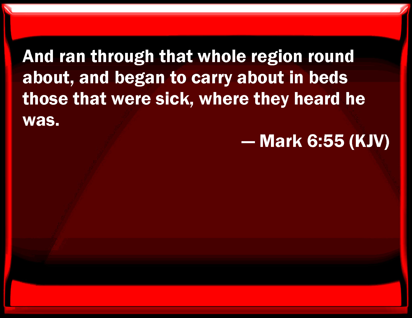 Bible Verse Slide Mark 6:55 And ran through that whole region round about, and began to carry about in beds those that were sick, where they heard he was. KJV: And ran through that whole region round about, and began to carry about in beds those that were sick, where they heard he was. DRB: And running through that whole country, they began to carry about in beds those that were sick, where they heard he was. DBT: they ran through that whole country around, and began to carry about those that were ill on couches, where they heard that he was. ERV: and ran round about that whole region, and began to carry about on their beds those that were sick, where they heard he was. WBT: And ran through that whole region around, and began to carry about in beds those that were sick, where they heard he was. WEB: and ran around that whole region, and began to bring those who were sick, on their mats, to where they heard he was. YLT: having run about through all that region round about, they began upon the couches to carry about those ill, where they were hearing that he is,Links Mark 6:55 NIV • Mark 6:55 NLT • Mark 6:55 ESV • Mark 6:55 NASB • Mark 6:55 KJV • Mark 6:55 Interlinear • Mark 6:55 Commentaries • Mark 6:55 Parallel Texts • Mark 6:55 Bible Apps • Mark 6:55 Parallel • Bible Hub |