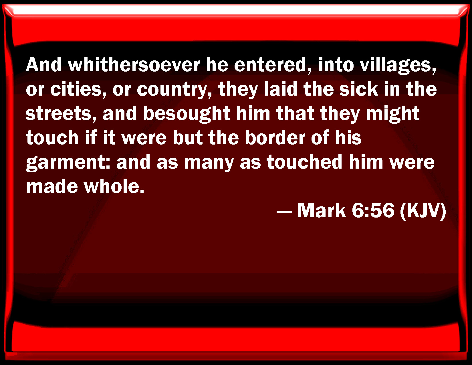 Bible Verse Slide Mark 6:56 And wherever he entered, into villages, or cities, or country, they laid the sick in the streets, and sought him that they might touch if it were but the border of his garment: and as many as touched him were made whole. KJV: And whithersoever he entered, into villages, or cities, or country, they laid the sick in the streets, and besought him that they might touch if it were but the border of his garment: and as many as touched him were made whole. DRB: And whithersoever he entered, into towns or into villages or cities, they laid the sick in the streets, and besought him that they might touch but the hem of his garment: and as many as touched him were made whole. DBT: And wherever he entered into villages, or cities, or the country, they laid the sick in the market-places, and besought him that they might touch if it were only the hem of his garment; and as many as touched him were healed. ERV: And wheresoever he entered, into villages, or into cities, or into the country, they laid the sick in the marketplaces, and besought him that they might touch if it were but the border of his garment: and as many as touched him were made whole. WBT: And whithersoever he entered, into villages, or cities, or country, they laid the sick in the streets, and besought him that they might touch, if it were but the border of his garment: and as many as touched him, were healed. WEB: Wherever he entered, into villages, or into cities, or into the country, they laid the sick in the marketplaces, and begged him that they might touch just the fringe of his garment; and as many as touched him were made well. YLT: and wherever he was going, to villages, or cities, or fields, in the market-places they were laying the infirm, and were calling upon him, that they may touch if it were but the fringe of his garment, and as many as were touching him were saved.Links Mark 6:56 NIV • Mark 6:56 NLT • Mark 6:56 ESV • Mark 6:56 NASB • Mark 6:56 KJV • Mark 6:56 Interlinear • Mark 6:56 Commentaries • Mark 6:56 Parallel Texts • Mark 6:56 Bible Apps • Mark 6:56 Parallel • Bible Hub |