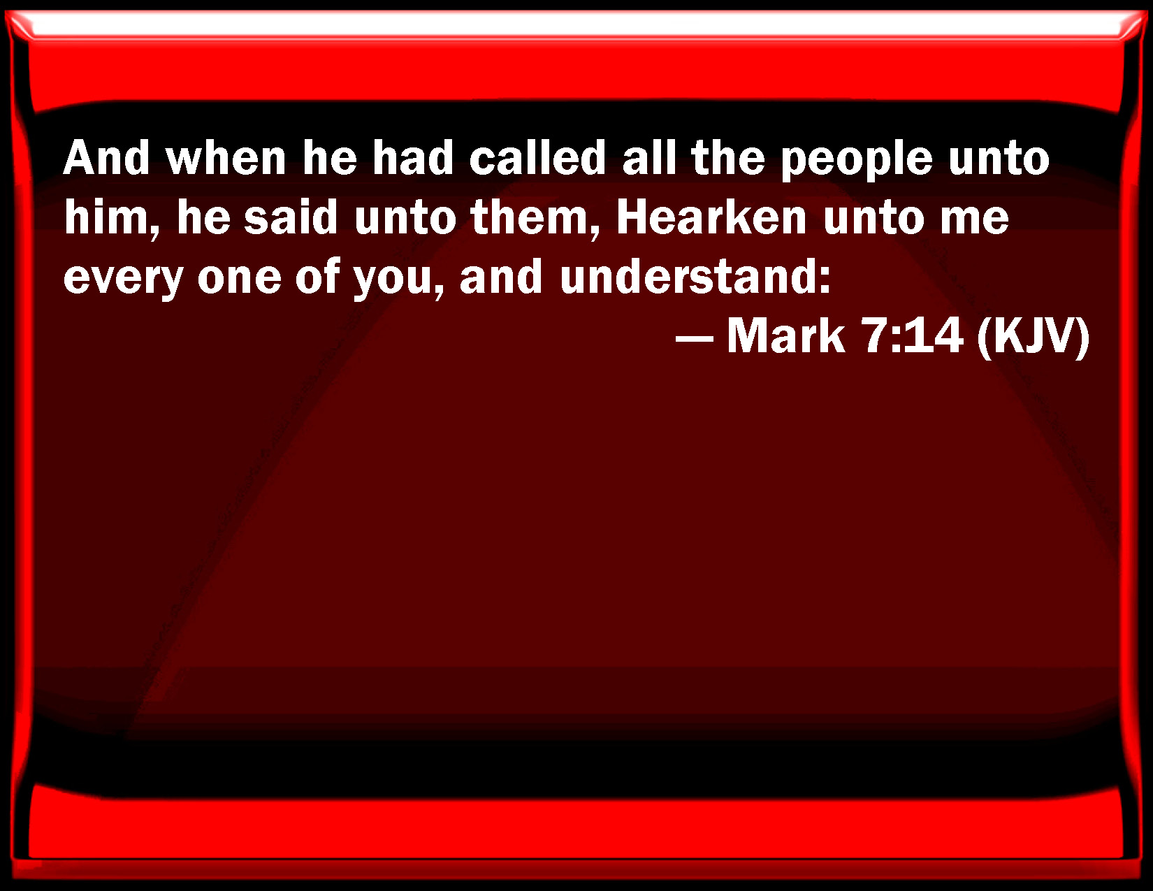 Bible Verse Slide Mark 7:14 And when he had called all the people to him, he said to them, Listen to me every one of you, and understand: KJV: And when he had called all the people unto him, he said unto them, Hearken unto me every one of you, and understand: DRB: And calling again the multitude unto him, he said to them: Hear ye me all, and understand. DBT: And having called again the crowd, he said to them, Hear me, all of you, and understand: ERV: And he called to him the multitude again, and said unto them, Hear me all of you, and understand: WBT: And when he had called all the people to him, he said to them, Hearken to me every one of you, and understand. WEB: He called all the multitude to himself, and said to them, "Hear me, all of you, and understand. YLT: And having called near all the multitude, he said to them, 'Hearken to me, ye all, and understand;Links Mark 7:14 NIV • Mark 7:14 NLT • Mark 7:14 ESV • Mark 7:14 NASB • Mark 7:14 KJV • Mark 7:14 Interlinear • Mark 7:14 Commentaries • Mark 7:14 Parallel Texts • Mark 7:14 Bible Apps • Mark 7:14 Parallel • Bible Hub |