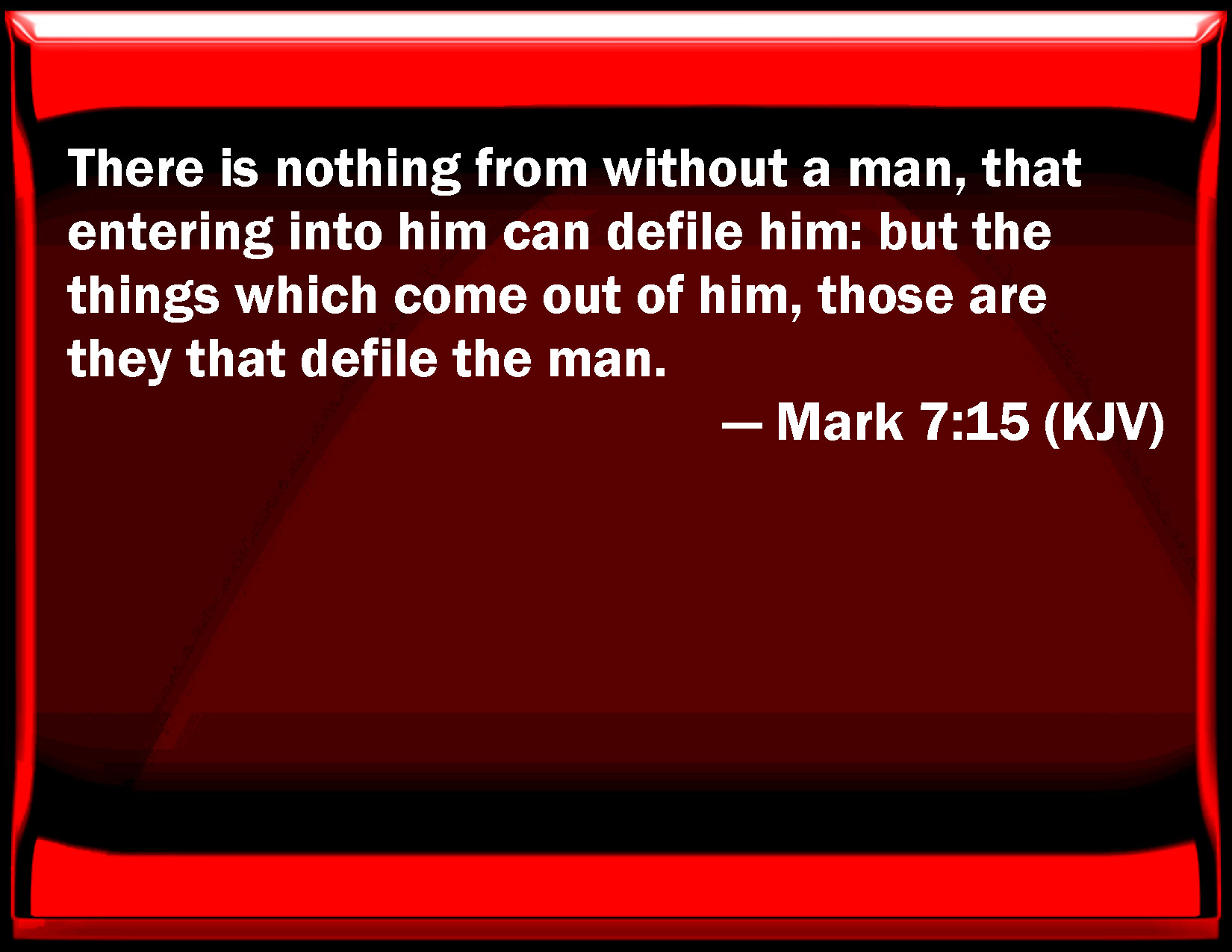 Bible Verse Slide Mark 7:15 There is nothing from without a man, that entering into him can defile him: but the things which come out of him, those are they that defile the man. KJV: There is nothing from without a man, that entering into him can defile him: but the things which come out of him, those are they that defile the man. DRB: There is nothing from without a man that entering into him, can defile him. But the things which come from a man, those are they that defile a man. DBT: There is nothing from outside a man entering into him which can defile him; but the things which go out from him, those it is which defile the man. ERV: there is nothing from without the man, that going into him can defile him: but the things which proceed out of the man are those that defile the man. WBT: There is nothing from without a man, that entering into him, can defile him: but the things which come out of him, those are they that defile the man. WEB: There is nothing from outside of the man, that going into him can defile him; but the things which proceed out of the man are those that defile the man. YLT: there is nothing from without the man entering into him that is able to defile him, but the things coming out from him, those are the things defiling the man.Links Mark 7:15 NIV • Mark 7:15 NLT • Mark 7:15 ESV • Mark 7:15 NASB • Mark 7:15 KJV • Mark 7:15 Interlinear • Mark 7:15 Commentaries • Mark 7:15 Parallel Texts • Mark 7:15 Bible Apps • Mark 7:15 Parallel • Bible Hub |