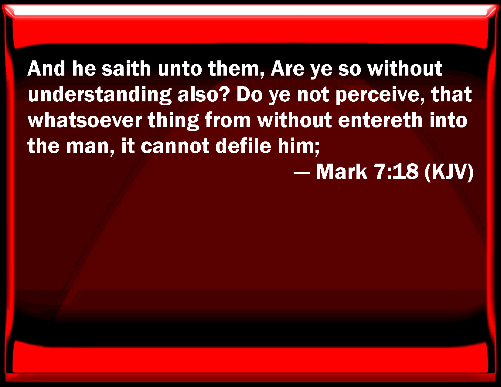 Bible Verse Slide Mark 7:18 And he said to them, Are you so without understanding also? Do you not perceive, that whatever thing from without enters into the man, it cannot defile him; KJV: And he saith unto them, Are ye so without understanding also? Do ye not perceive, that whatsoever thing from without entereth into the man, it cannot defile him; DRB: And he saith to them: So are you also without knowledge? understand you not that every thing from without, entering into a man cannot defile him: DBT: And he says to them, Are ye also thus unintelligent? Do ye not perceive that all that is outside entering into the man cannot defile him, ERV: And he saith unto them, Are ye so without understanding also? Perceive ye not, that whatsoever from without goeth into the man, it cannot defile him; WBT: And he saith to them, Are ye so void of understanding also? Do ye not perceive, that whatever thing from without entereth into the man, it cannot defile him. WEB: He said to them, "Are you thus without understanding also? Don't you perceive that whatever goes into the man from outside can't defile him, YLT: and he saith to them, 'So also ye are without understanding! Do ye not perceive that nothing from without entering into the man is able to defile him?Links Mark 7:18 NIV • Mark 7:18 NLT • Mark 7:18 ESV • Mark 7:18 NASB • Mark 7:18 KJV • Mark 7:18 Interlinear • Mark 7:18 Commentaries • Mark 7:18 Parallel Texts • Mark 7:18 Bible Apps • Mark 7:18 Parallel • Bible Hub |