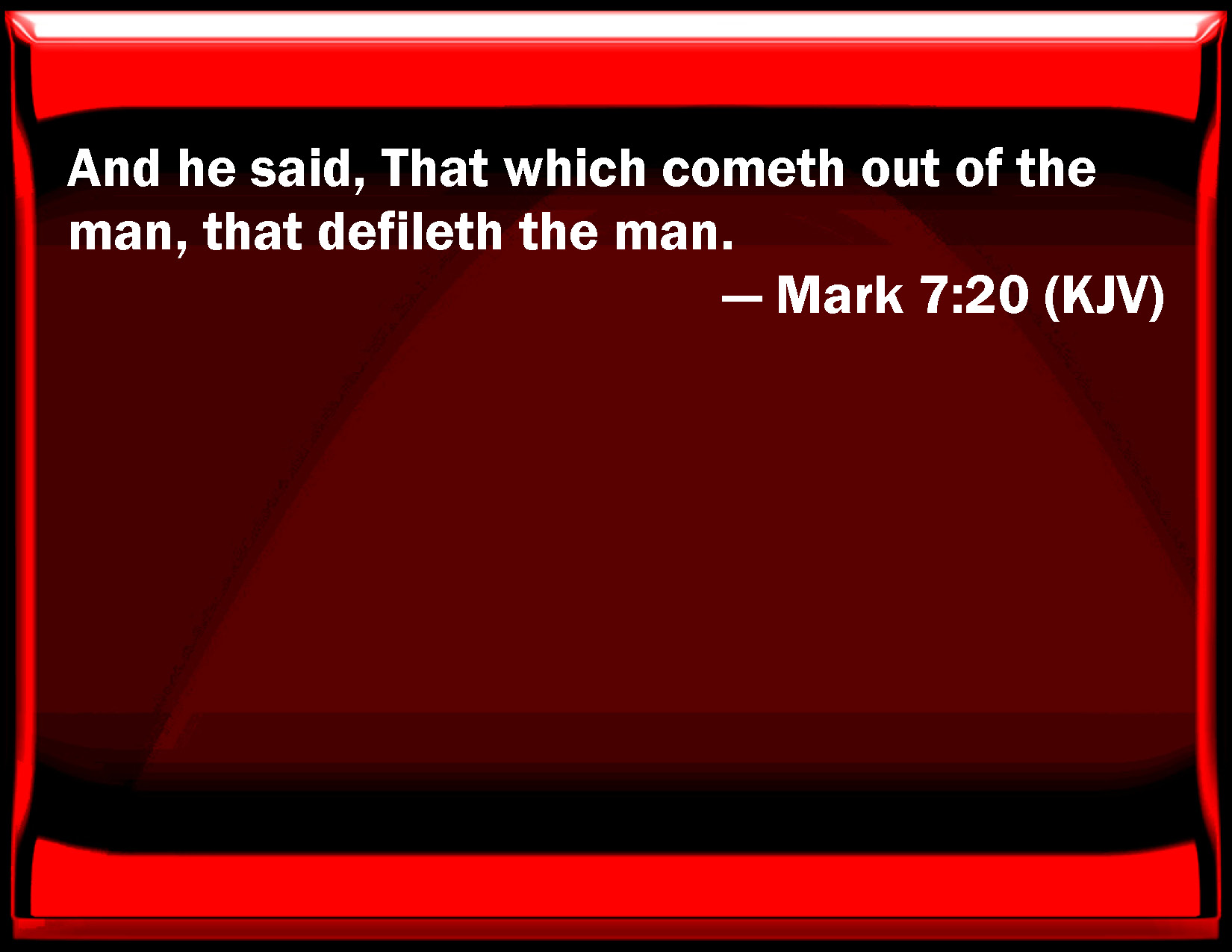 Bible Verse Slide Mark 7:20 And he said, That which comes out of the man, that defiles the man. KJV: And he said, That which cometh out of the man, that defileth the man. DRB: But he said that the things which come out from a man, they defile a man. DBT: And he said, That which goes forth out of the man, that defiles the man. ERV: And he said, That which proceedeth out of the man, that defileth the man. WBT: And he said, That which cometh out of the man, that defileth the man. WEB: He said, "That which proceeds out of the man, that defiles the man. YLT: And he said — 'That which is coming out from the man, that doth defile the man;Links Mark 7:20 NIV • Mark 7:20 NLT • Mark 7:20 ESV • Mark 7:20 NASB • Mark 7:20 KJV • Mark 7:20 Interlinear • Mark 7:20 Commentaries • Mark 7:20 Parallel Texts • Mark 7:20 Bible Apps • Mark 7:20 Parallel • Bible Hub |